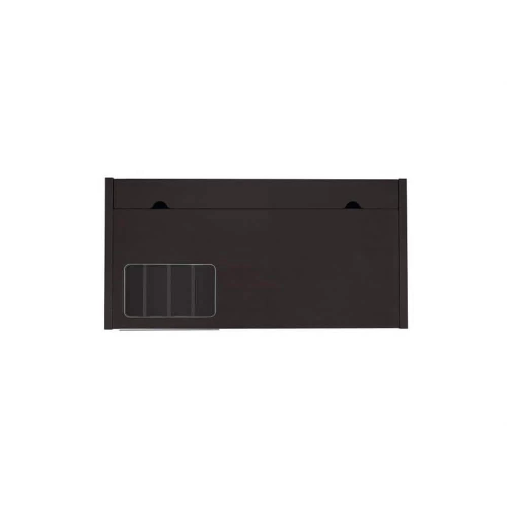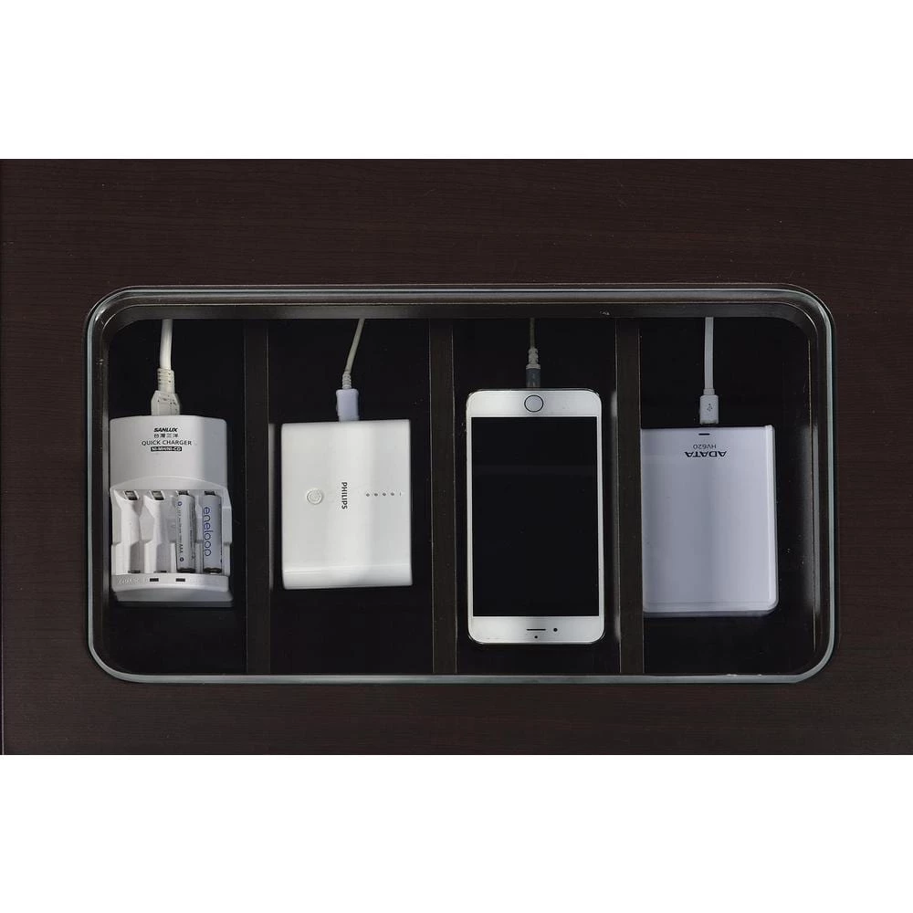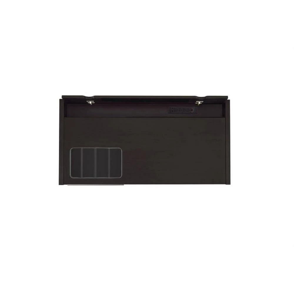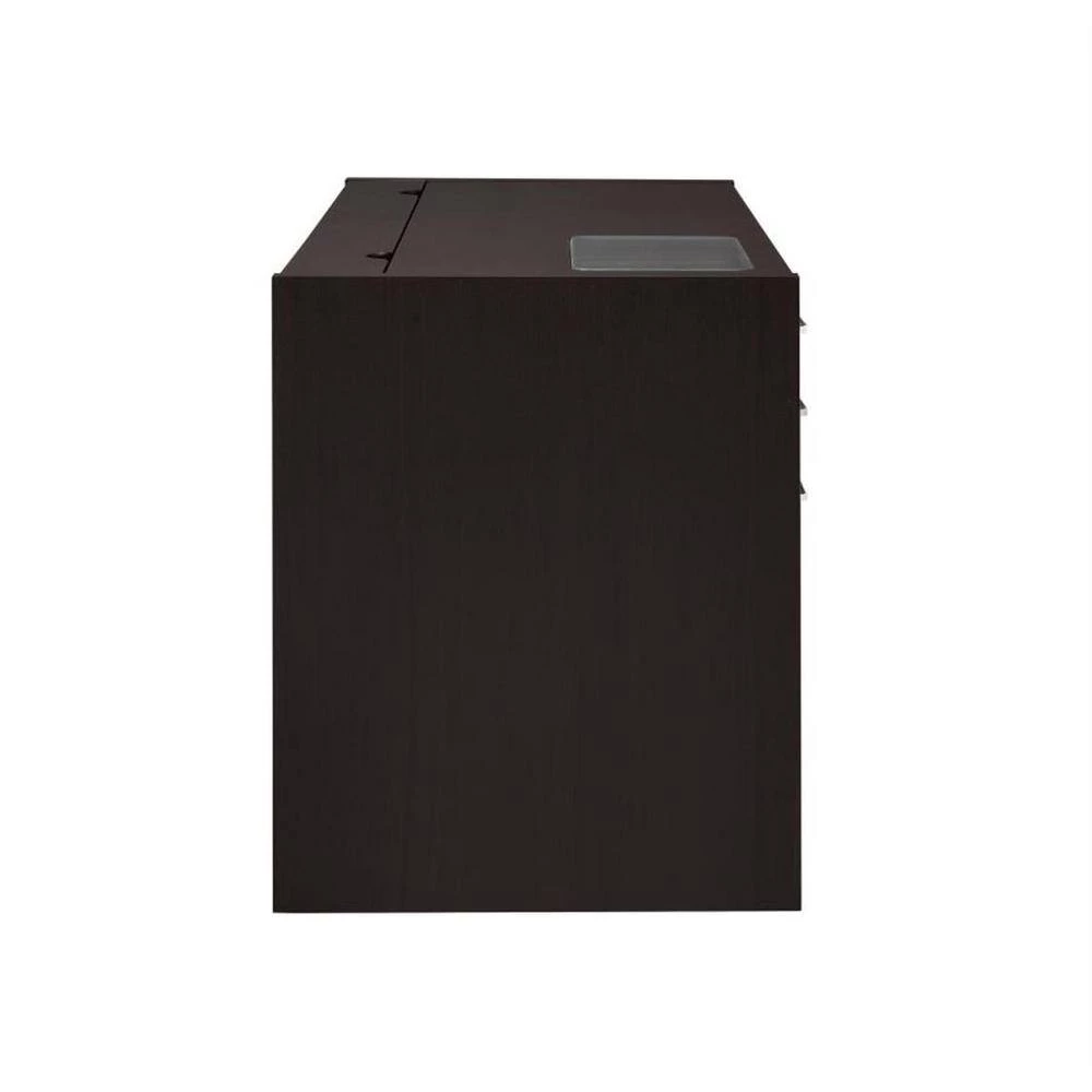 A basic piece with tasteful upgrades, this computer desk stays atop tech needs while offering a fresh, modular aesthetic. Finished in deep cappuccino, it offers versatility and bold style. Find everything you need for smooth computing, including two drawers and a keyboard drawer with Euro glides and a storage cabinet with an adjustable shelf. Components and devices are viewable through a clear tempered glass insert on the desktop. Enjoy the convenience of a power outlet within lift-top storage.
