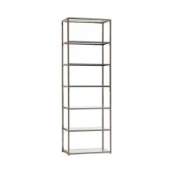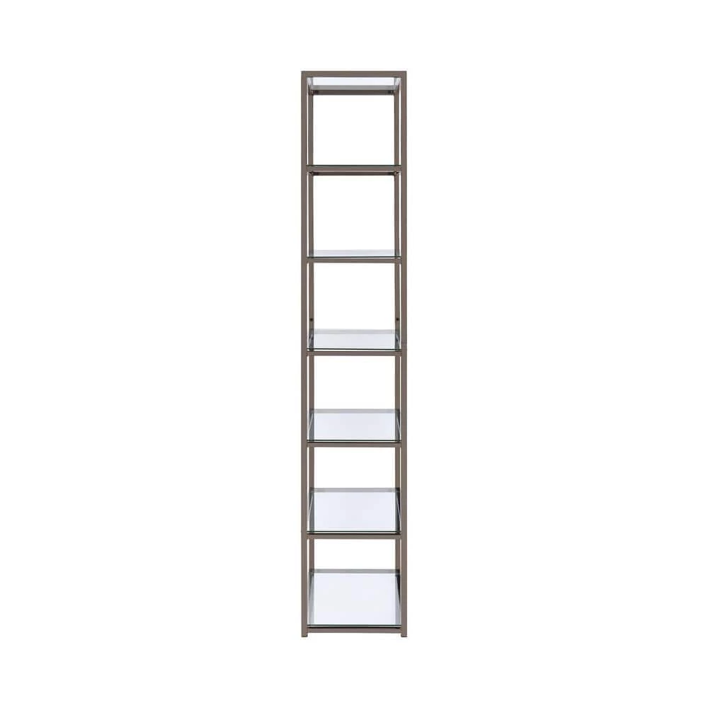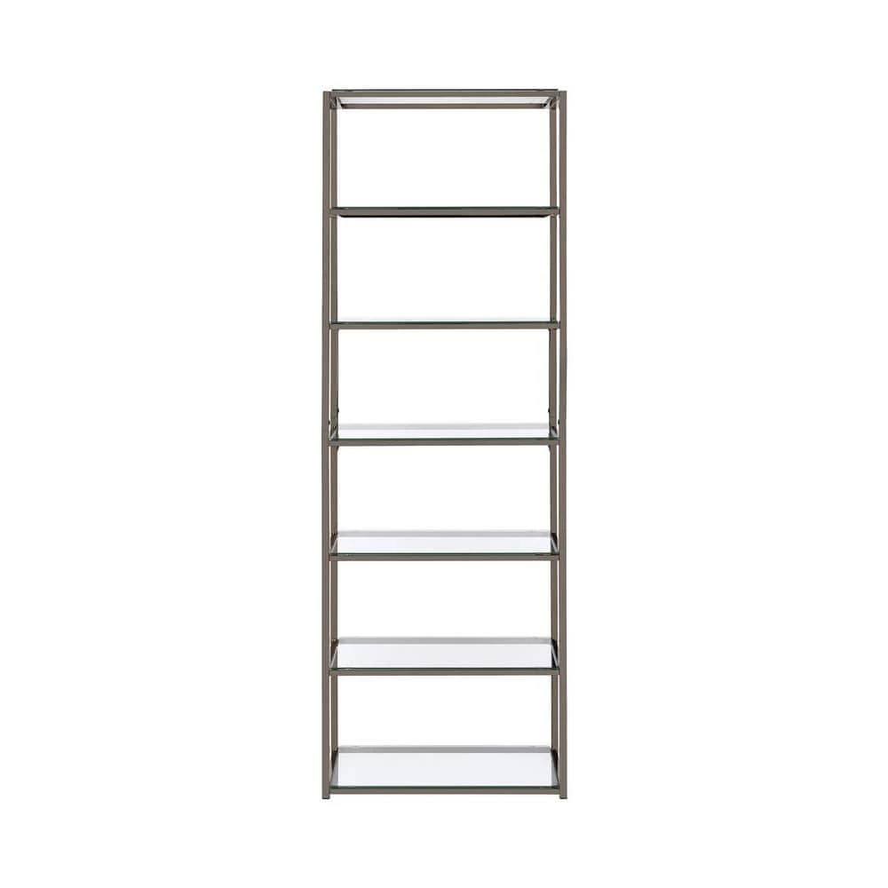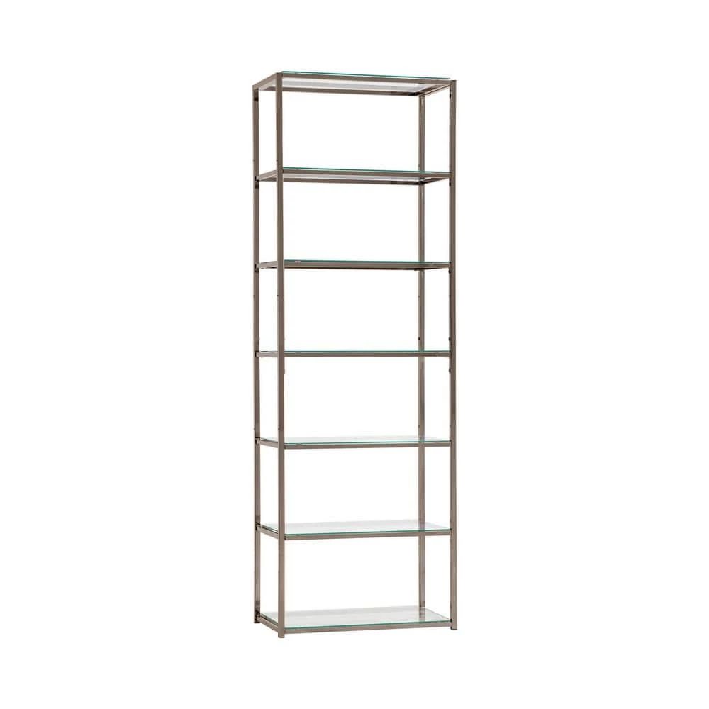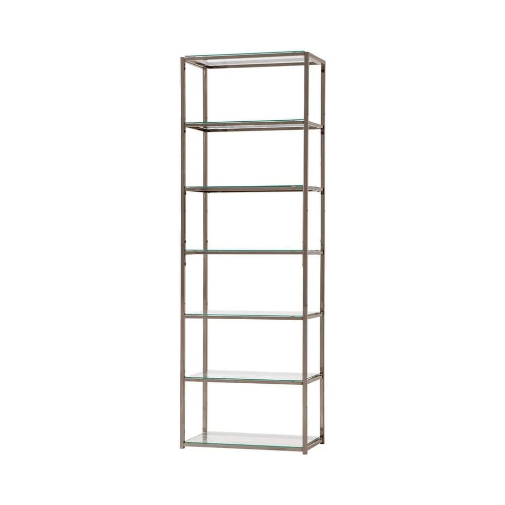 Sleek, elegant, and stylish. This bookcase brings a tasteful look to a contemporary living room or family space. Built from steel with a black nickel finish, its frame is delightfully neutral and yet beautiful. Clear tempered glass shelving offers a gorgeous coordinating look. Display decor, books, and miscellaneous on six tiers of shelving.