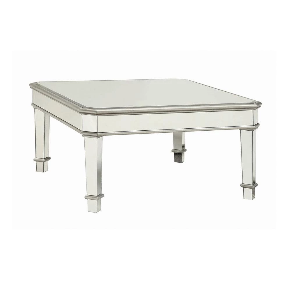 Liven up a living room with contemporary class. This modern coffee table provides an elegant setting to gather family and friends for a relaxing evening of conversation. Its silver finish is enhanced by mirrored panels for a touch of glam. Its four tapered legs are also adorned by mirrors, amplifying its reflective shine. This table has a truly sophisticated appearance, pulling a room together in style.