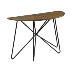Where will you place this sofa table from the Churchill collection. Demilune shape allows for perfect placement along a wall, or the back of a sofa. The starburst tabletop pattern boasts a warm, dark wood finish, which harmonizes with the black finish adorning the metal table legs. Display your affinity for the mid-century modern style, in these textbook hairpin table legs. Complete the transformation of your space with the matching end and coffee table from this same collection.