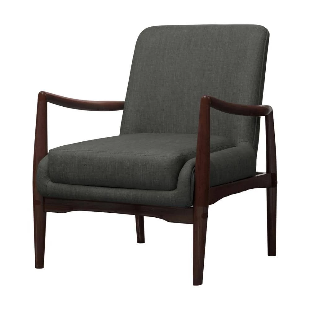 Add a subtle touch of style to your living room decor. This mid-century modern armchair exudes classic character. Tapered legs and curved armrests add visual intrigue to its simple silhouette. Dark grey linen-like upholstery adds pleasing texture as it contrasts elegantly with the dark wood base. Complete with thick, plush cushioning, this stylish chair allows for hours of comfortable seating.