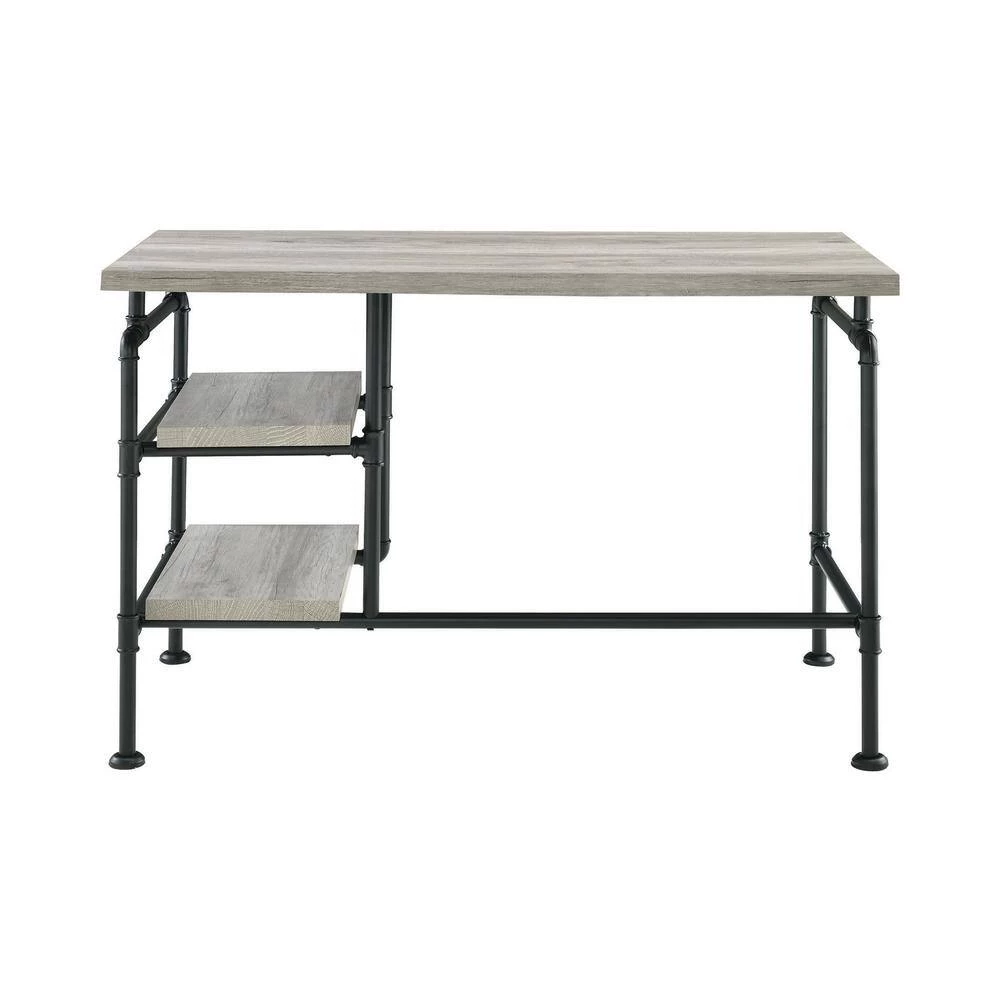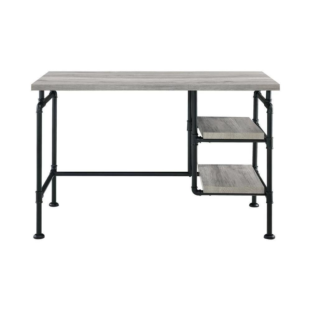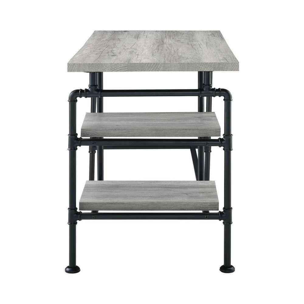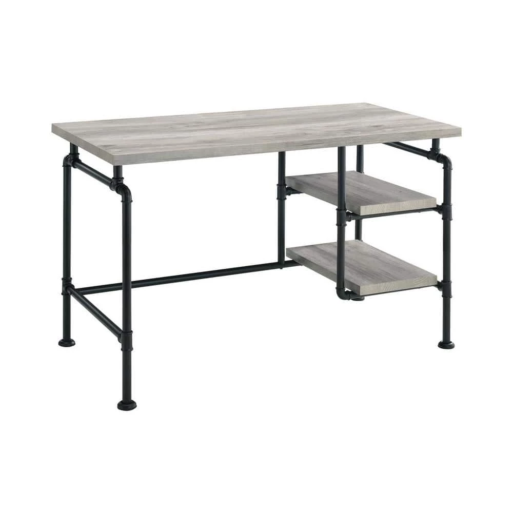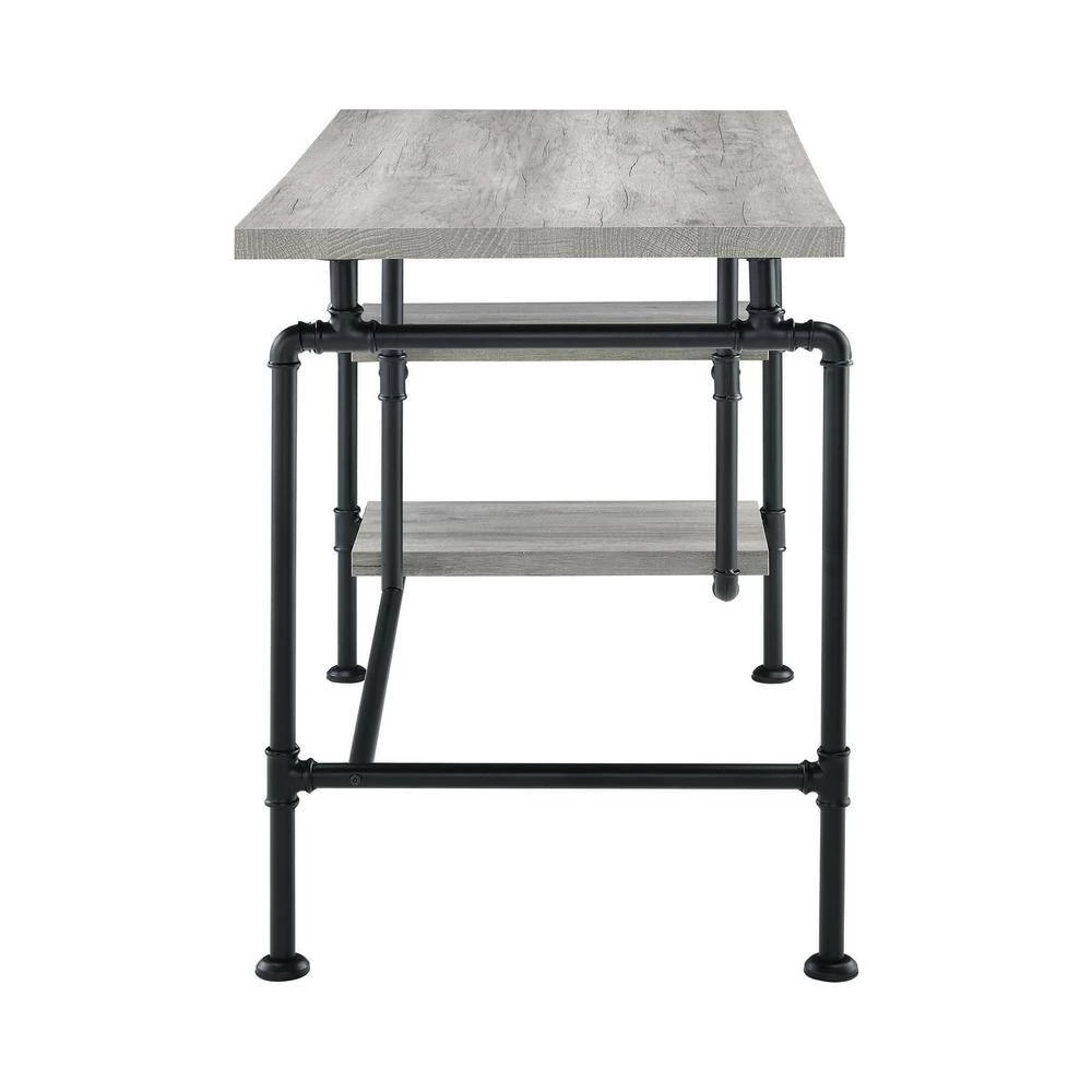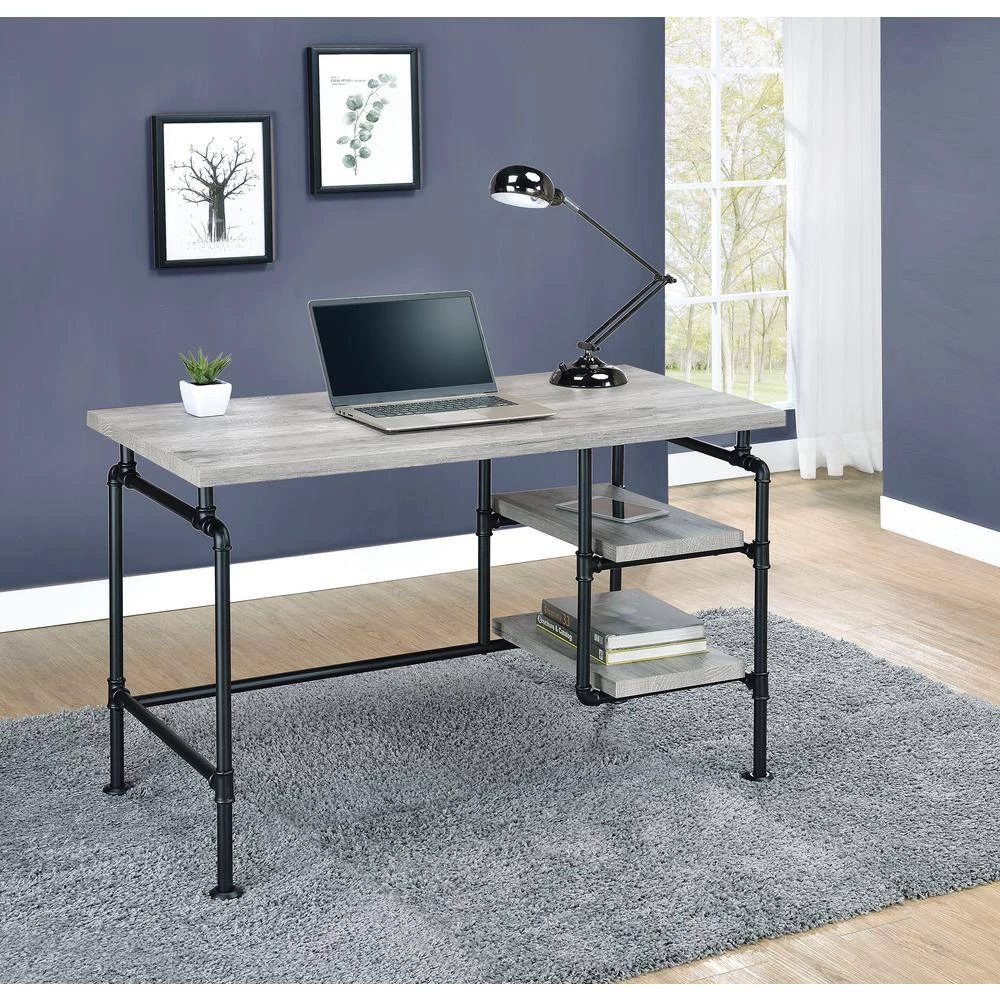 Embrace the eclectic with this writing desk from the Delray collection. The industrial elements are clearly on display with the black plumbing pipe frame. A relaxed, almost beachy vibe shows up with the grey driftwood finish. Easily reach your items with two (2) tiers of beneath-the-desk open shelving. Combine with the bookcase in the same collection for a masterfully orchestrated industrial space.
