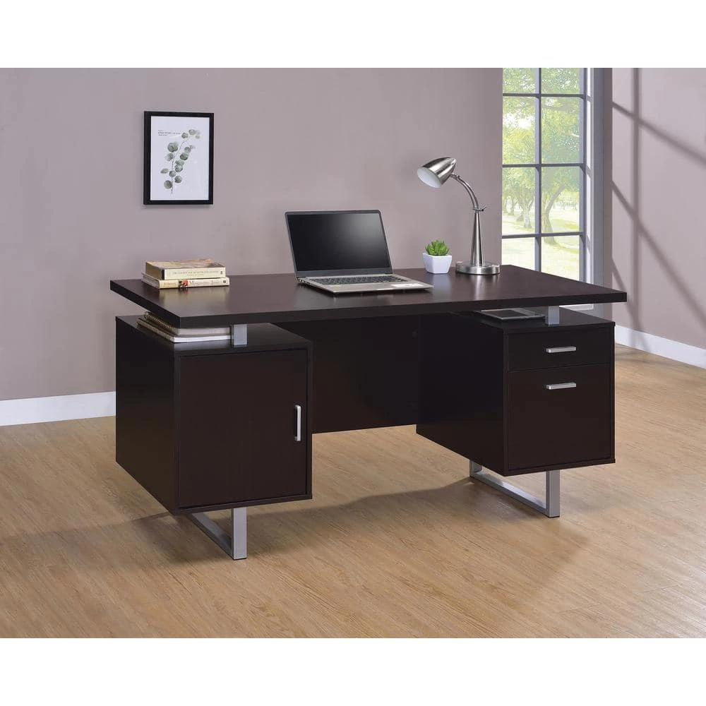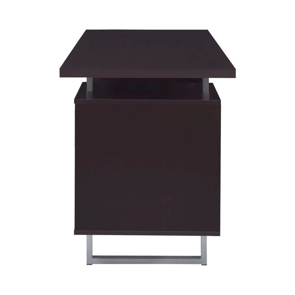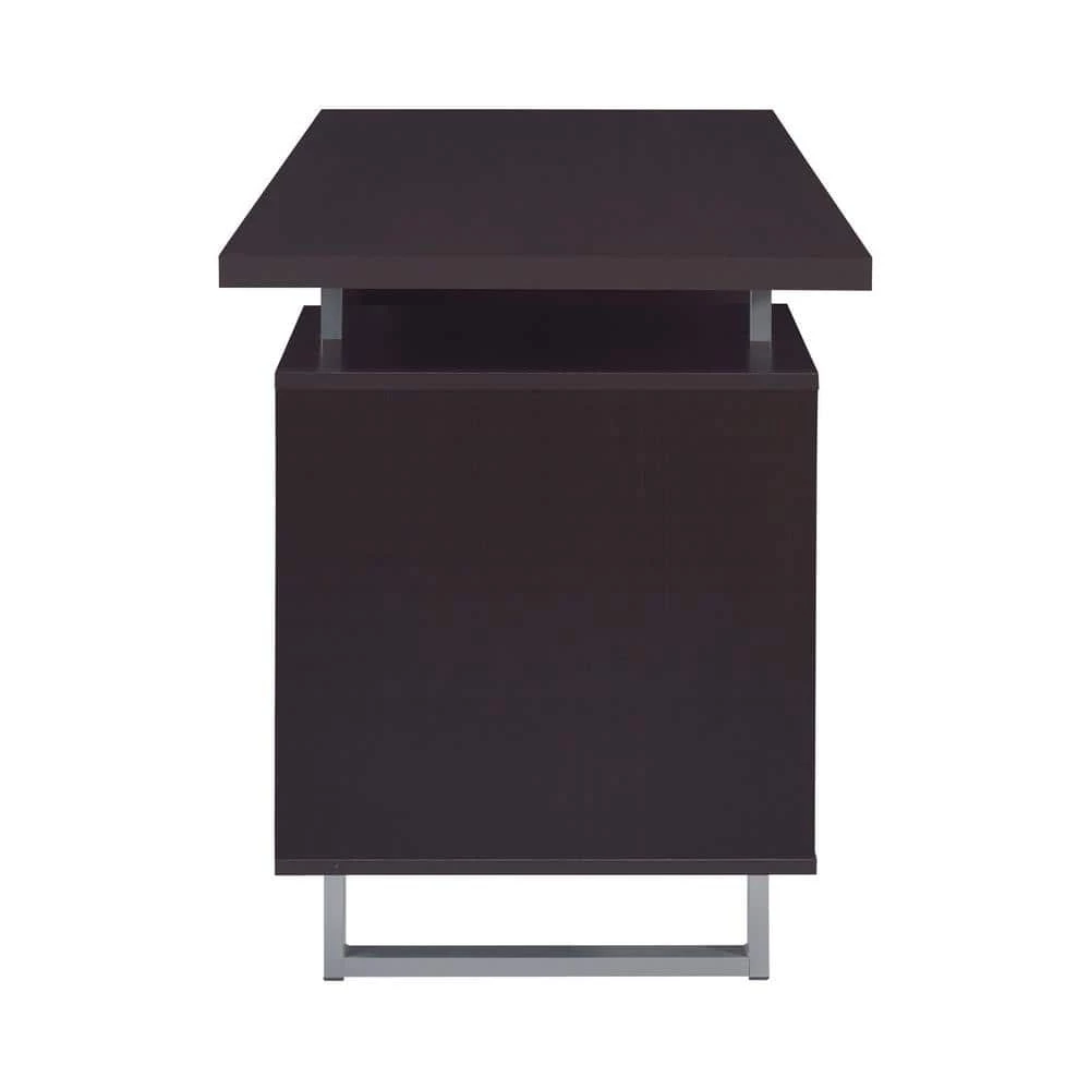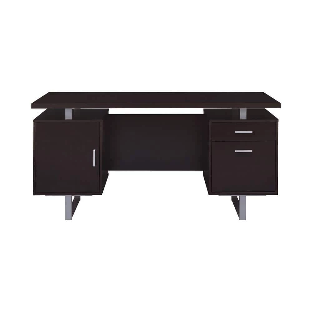 Enjoy an intriguing architectural design in this office desk. A floating top creates a visually enticing effect and a completely different look. Finished in deep cappuccino, it flatters surrounding decor and delivers a dramatic touch. Store essentials in a cabinet and drawer, and use a file cabinet to organize papers. Contrasting silver hardware and steel legs plays up the contemporary flavor of this stylish desk.