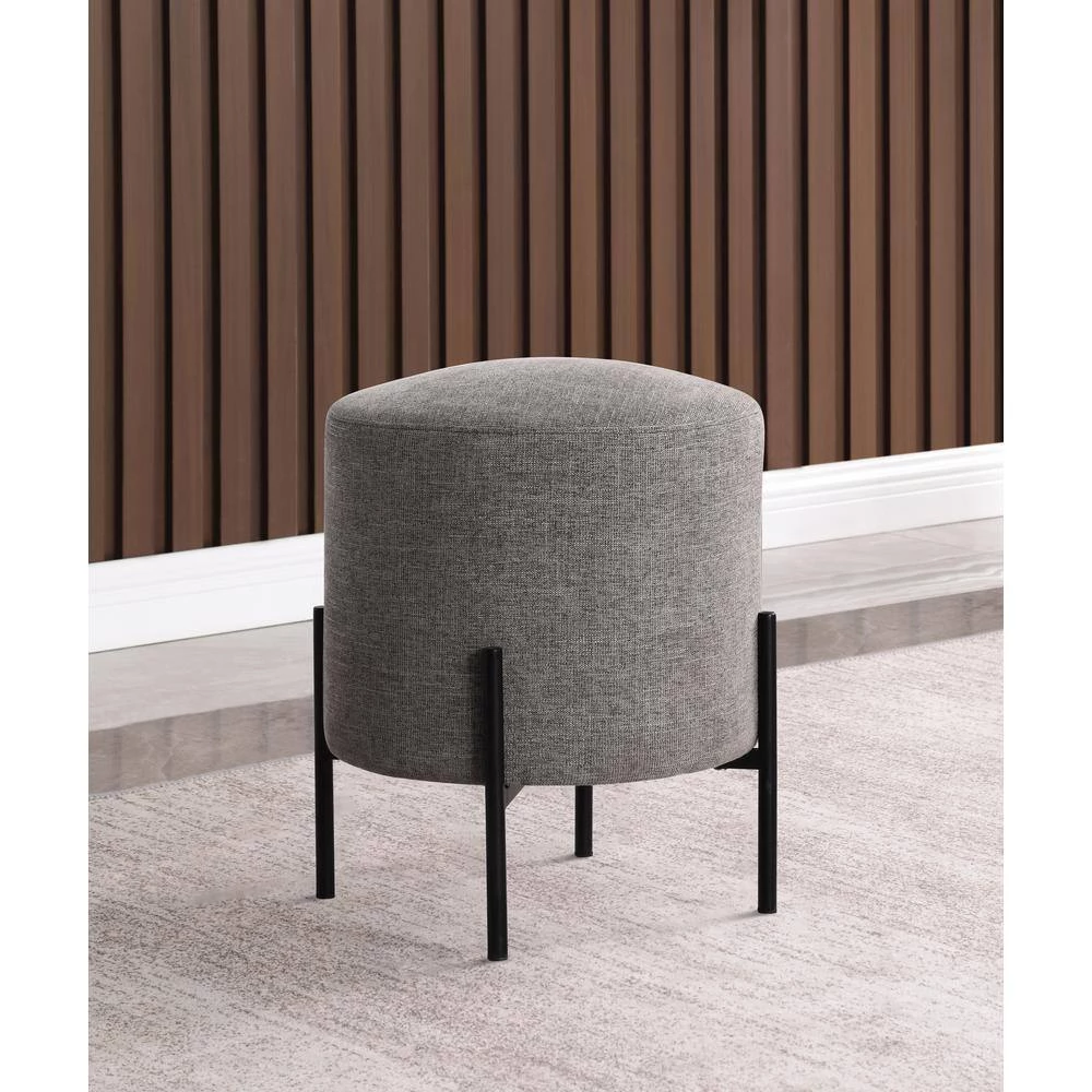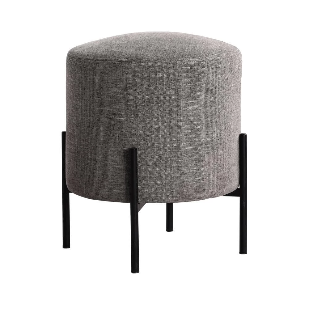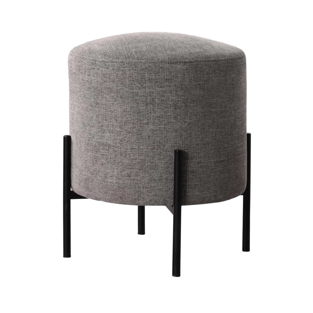 Round in shape with sleek, thin rod-like metal legs, this modern ottoman offers a minimal flair and extra seating. Wrapped in a soft-to-the touch chenille upholstery, this ottoman invites you to kick up your bare feet. Supported by a cross-brace design, the legs give a floating appearance and striking contrast with their matte black finish. Perfect for adding a retro touch or boho vibe to a space, this round ottoman works in contemporary living rooms and mid century modern homes. The chenille fabric comes available in three different shades, allowing you to match as you wish.