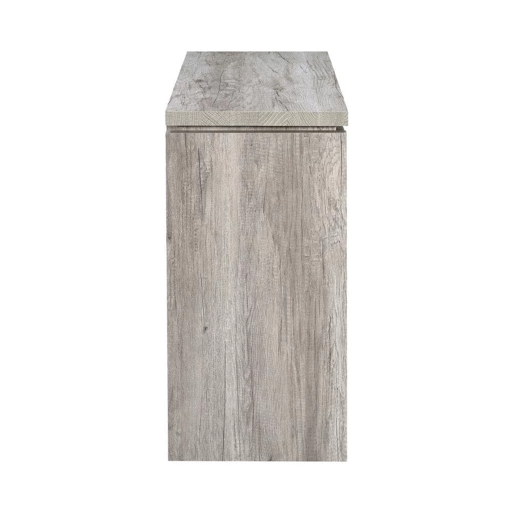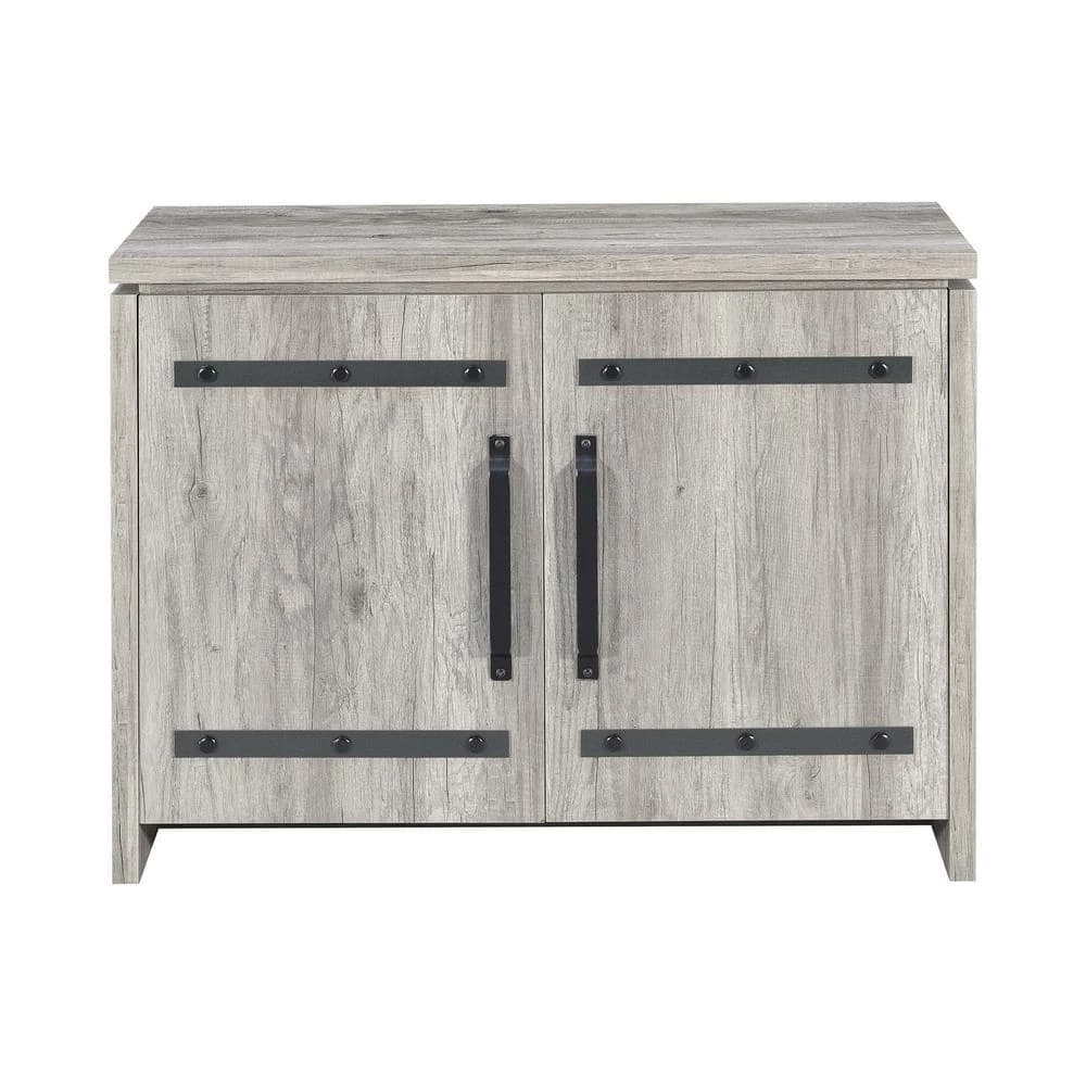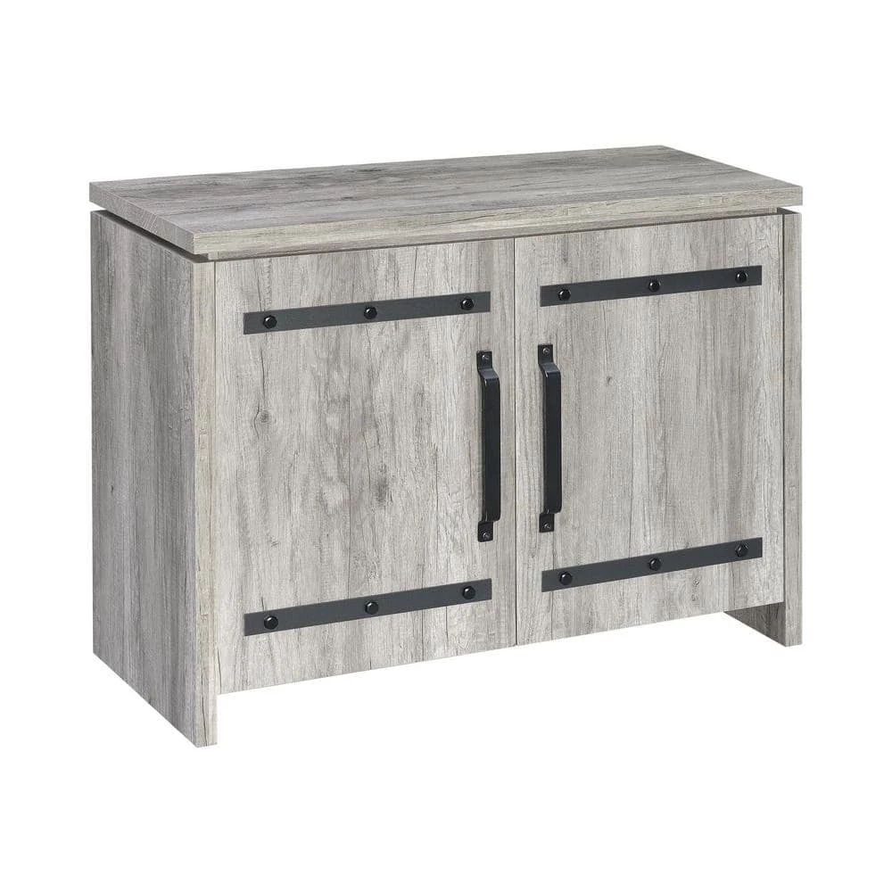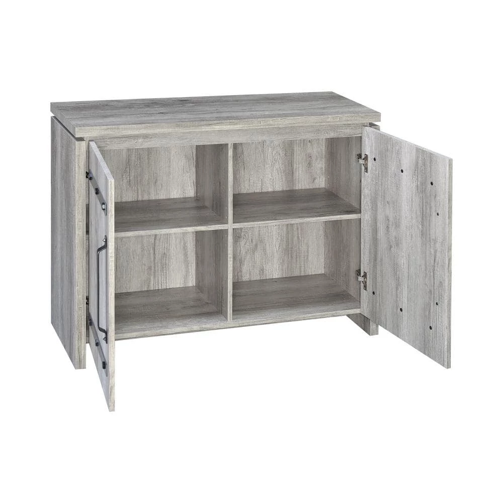 - Grey driftwood finish brings a coastal and homey vibe to this accent cabinet