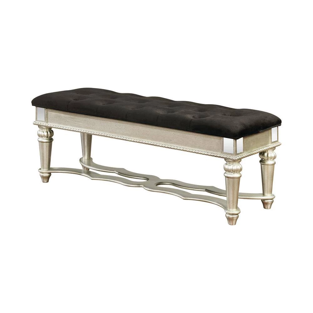 Put the final touch of luxury in that glamorous bedroom with this upholstered bench from the Heidi collection. This upholstered dressing bench displays a shimmering metallic platinum finish, complete with mirrored accent panels for a glam look. The rich black velvet upholstery features button-tufted details, for a design that’s both comfortable and stylish. The lovely wood carved detail of the support frame and turned legs shows the care with which this piece was crafted. This glam bench works well as a dressing bench, a dining bench in a luxe dining room, or anywhere stylish additional seating is desired with a petite profile.