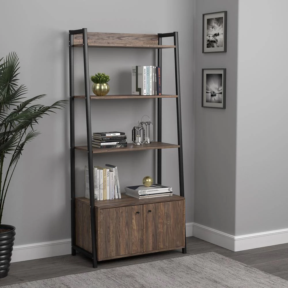 Ample storage options make this transitional bookcase a must-have for any home. Its spacious design features four tiers of shelving and a two-door cabinet with a divider inside. Its frame is comprised of sleek, straight lines made with durable metal in a bold, black finish. The shelves and cabinet are treated to a classic aged walnut finish for a tasteful and timeless look. This stylish piece is available as a single unit or as a three-piece set for a variety of options to organize your space.