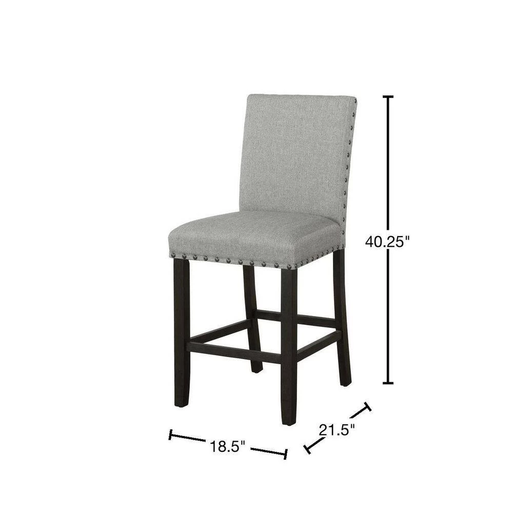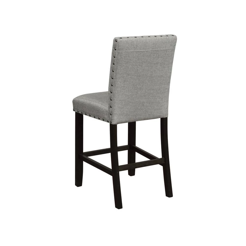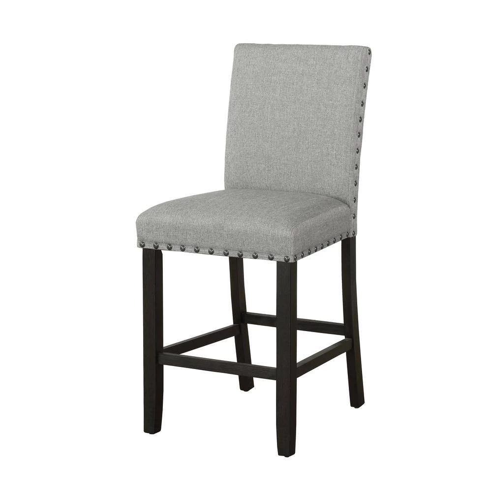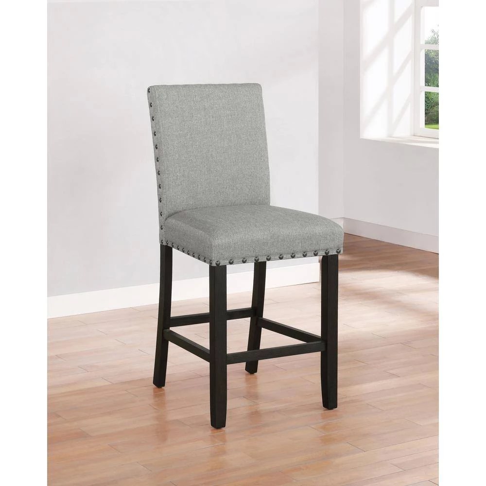 Place these stools next to a kitchen counter for a more rustic, casual look. Each foam-filled upholstered stool is wrapped in a woven linen-like fabric that offers complete comfort. Running along the backrest and seat are hand applied nailhead trims in a dark bronze finish. Constructed of a solid Asian hardwood, each stool offers stability and support, as well as 4 straight, squared legs and foot braces in a dark antique noir finish. Complete your entire dining space with a matching counter height table, available within the same collection.