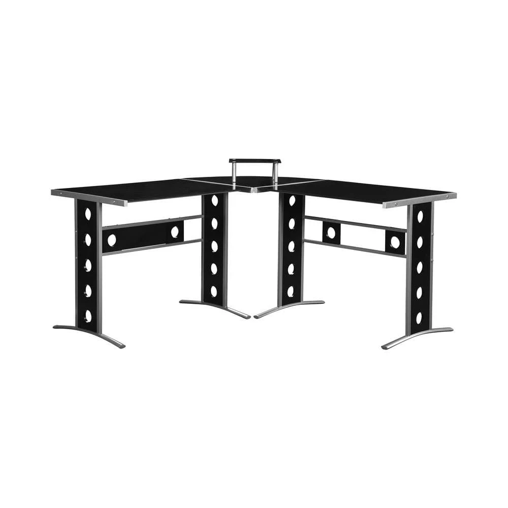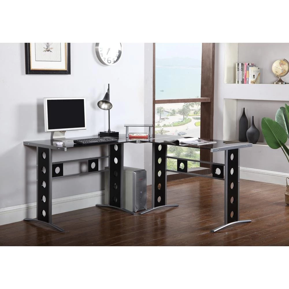 With a bold, contemporary design, this 3-piece writing desk set amplifies the style of a home office or library. Finishes of black and silver pleasingly complement each other for a funky, modern aesthetic. Its L shape tucks neatly into a corner to help you save space. A clear, tempered glass top adds sturdiness and shine, while a small corner shelf offers maximum functionality. Constructed from steel, MDF, and engineered veneer, this desk is a durable and stylish addition to any modern home.