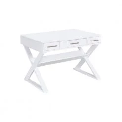 Grace and charm magnify the utilitarian quality of this writing desk. Ideal for a bedroom or casual space, its geometric silhouette adds a light touch. Constructed from materials including rubberwood, it delivers a stylish presence and plenty of convenience. Enjoy a fresh white finish with coordinating silver hardware. A trestle shelf offers bonus space for storage, and three felt-lined drawers include a keyboard drawer with smooth-operating Euro glides.