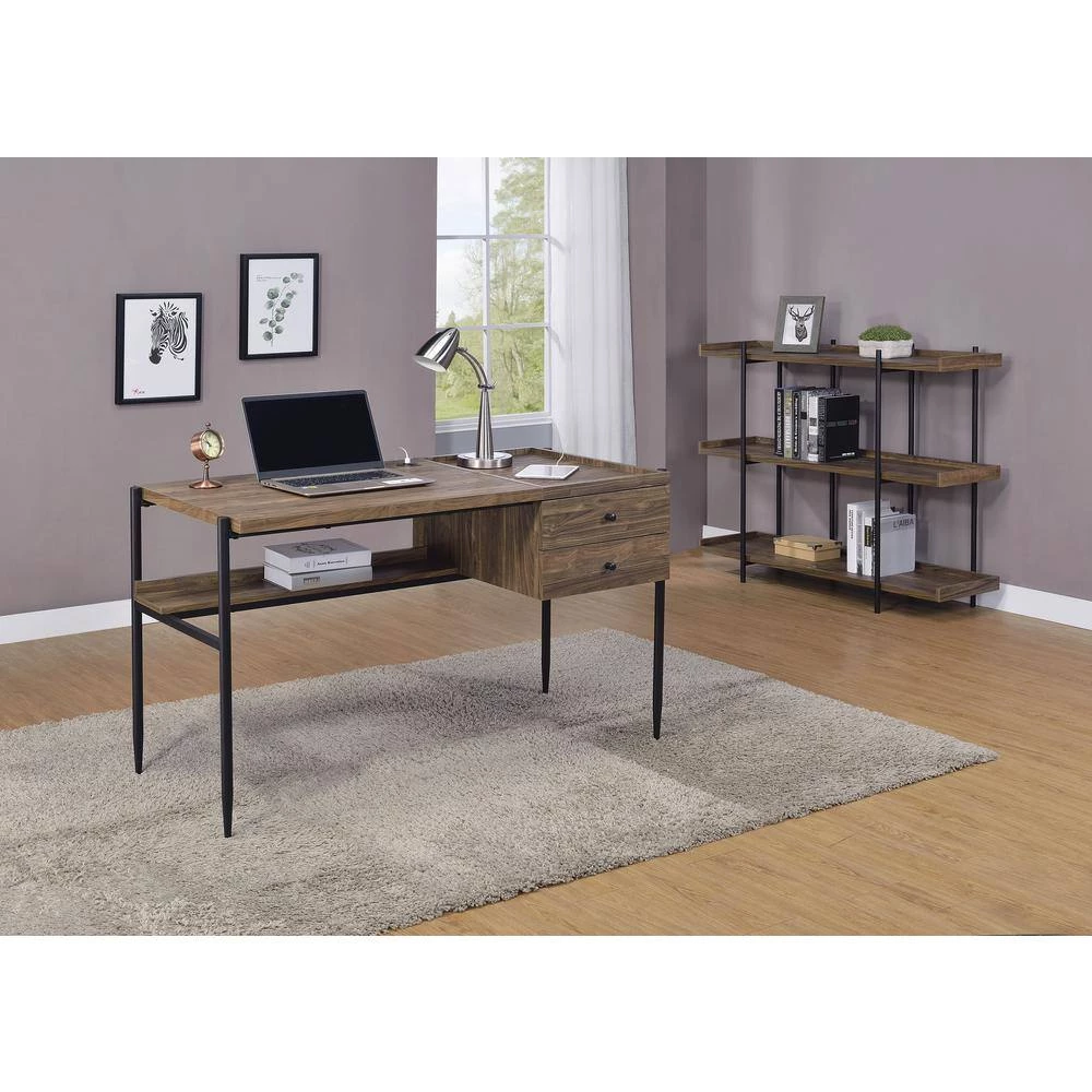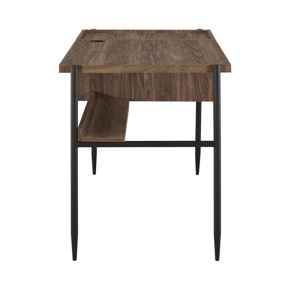 An effortless blend of wood and metal infuses this transitional writing desk with stylish simplicity. with a base comprised of sleek, straight lines, it has a clean and classic look. An aged walnut finish adds a rich, warm feel to its design. Two storage drawers and an open shelf provide ample space for your office essentials. Equipped with a convenient USB port, this wooden desk has all you need for hours of productivity.