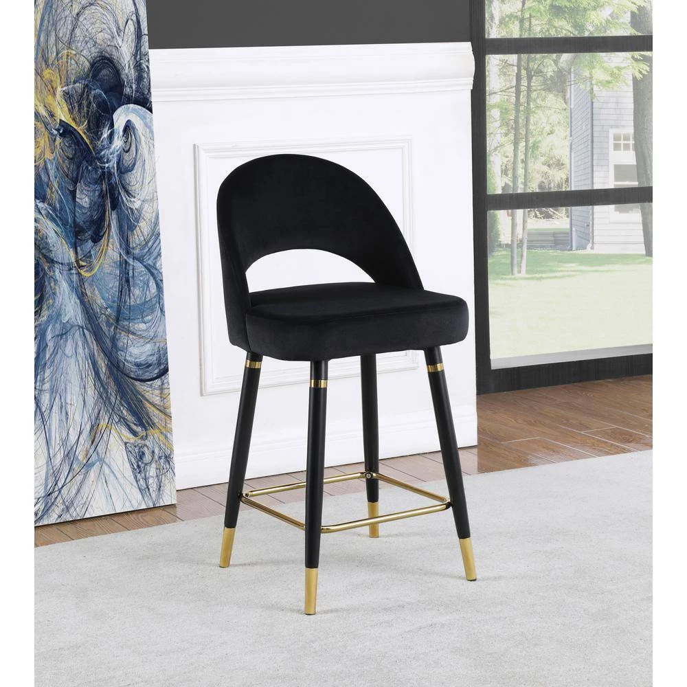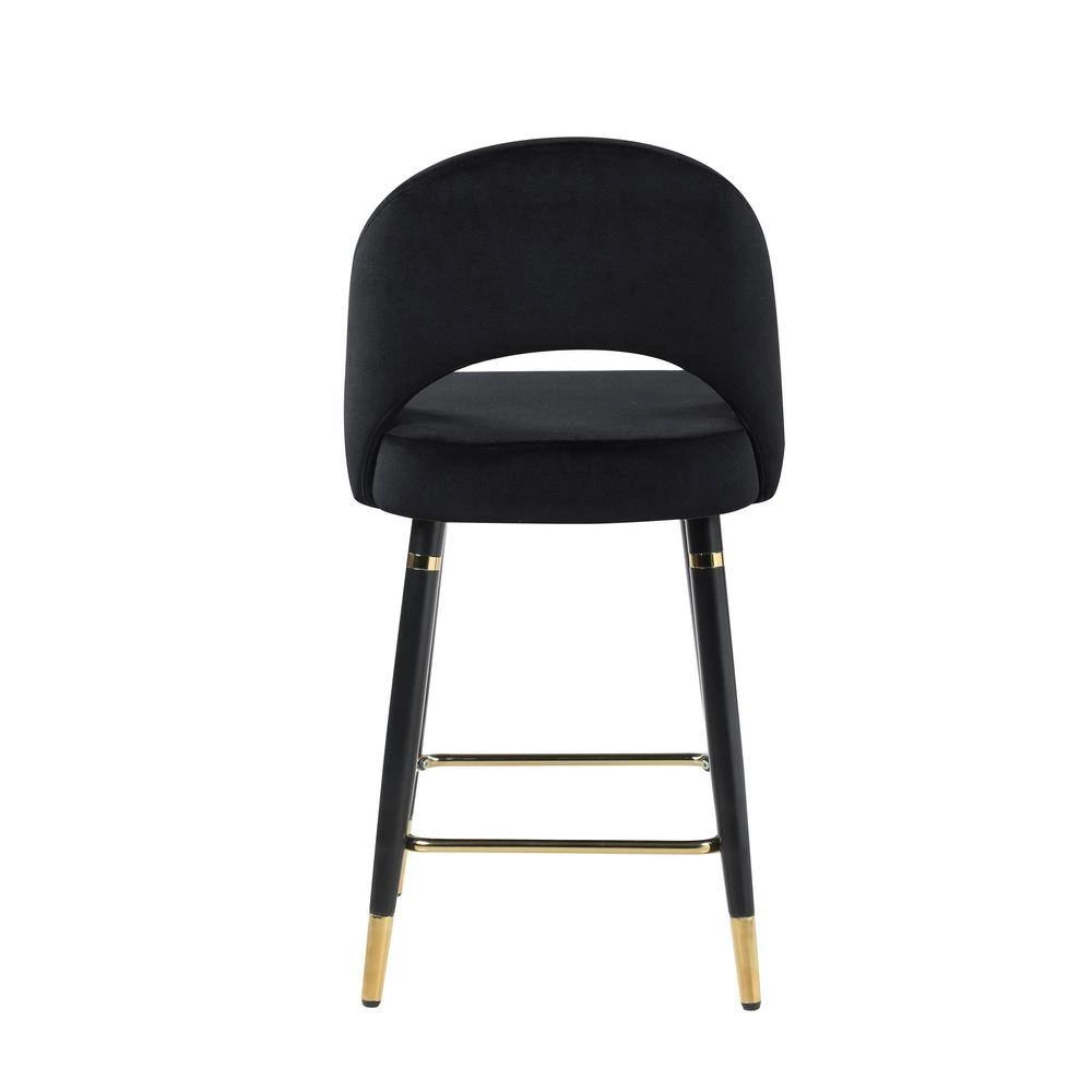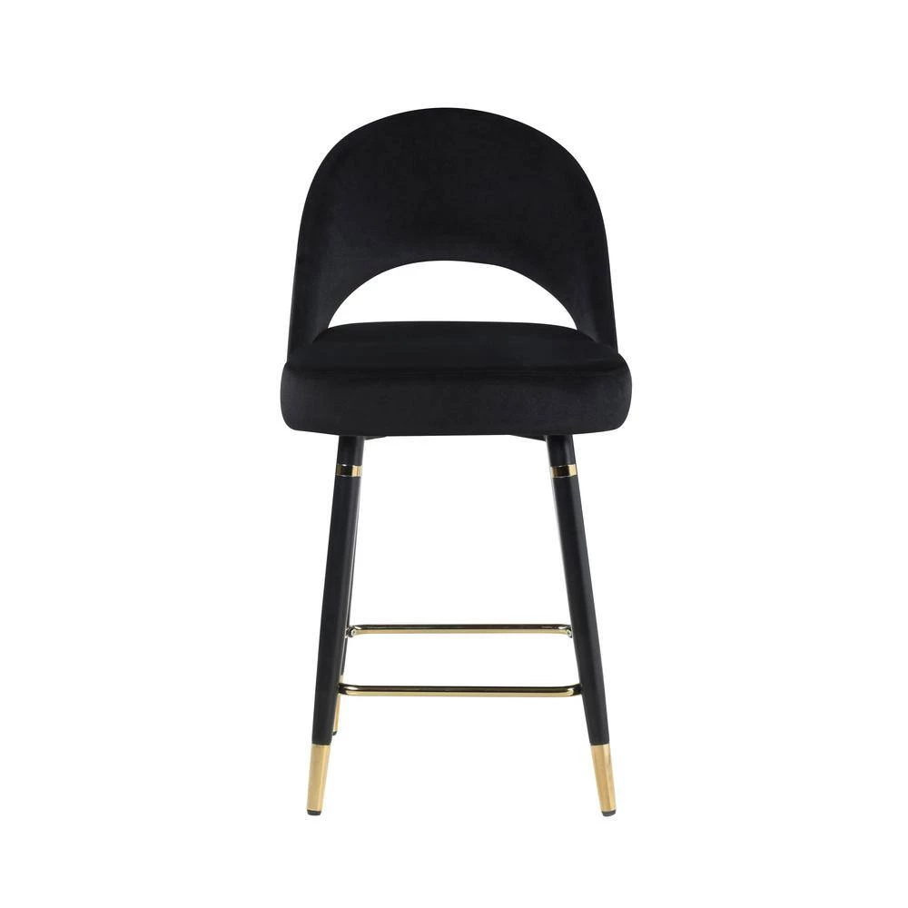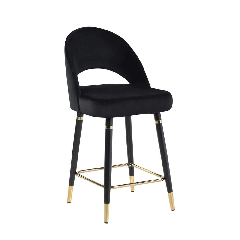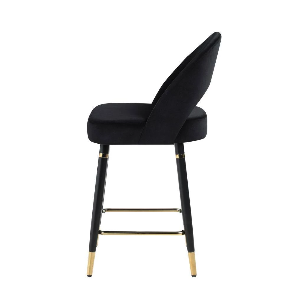 This set of 2-counter height stools features an elegant bucket style seat that lends a retro inspired Mid Century modern look. Each stool offers long-lasting, supportive seats for each guest, wrapped in velvet upholstery that complements numerous color palettes and adds a bold statement-piece. Flared, tapered legs further lend to the vintage flair. Gold capped feet and a supportive foot brace offer a dramatic, regal Hollywood glam touch. Pull these stools up to a spacious entertainment room bar for cocktails.