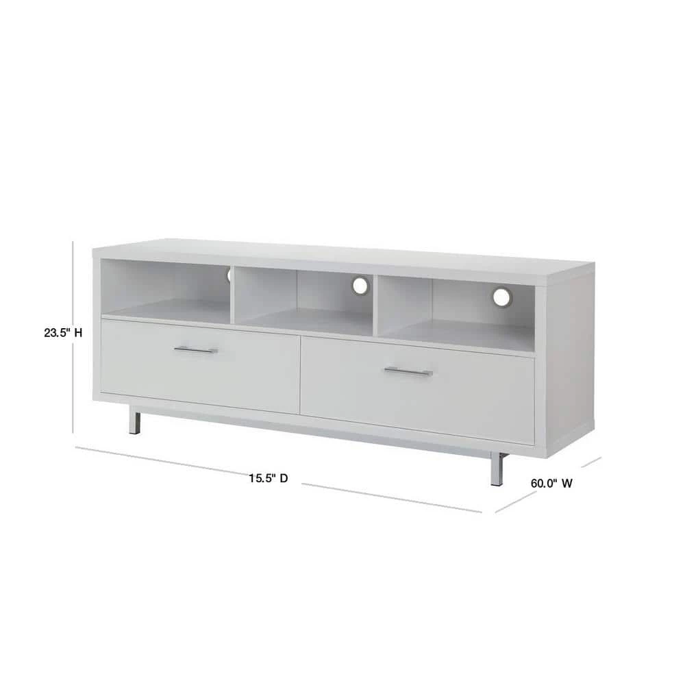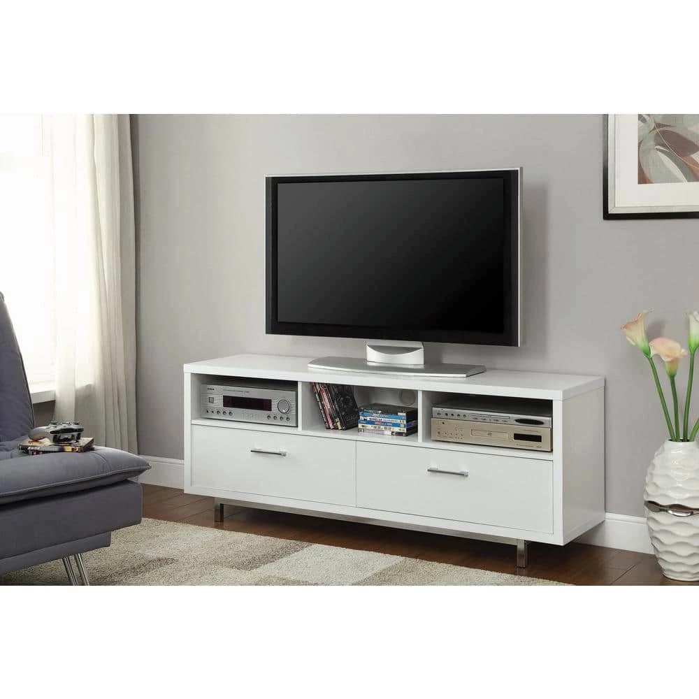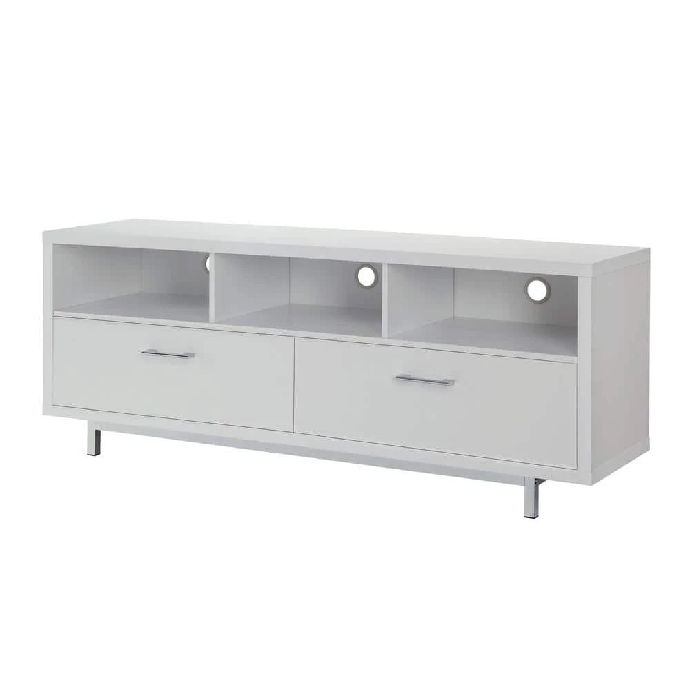 Ideal for a living room with contemporary decor, this TV console exudes updated style. The dazzling shine of chrome combines with a crisp, clean white finish for a pleasingly modern look. Its chic silhouette is complete with an elegant brushed silver frame, adding a pleasing touch of polish. Endlessly versatile, it features three open storage compartments and two large lower drawers to easily keep your space organized. For added depth and a more subdued look, this console is also available in deep, rich cappuccino.