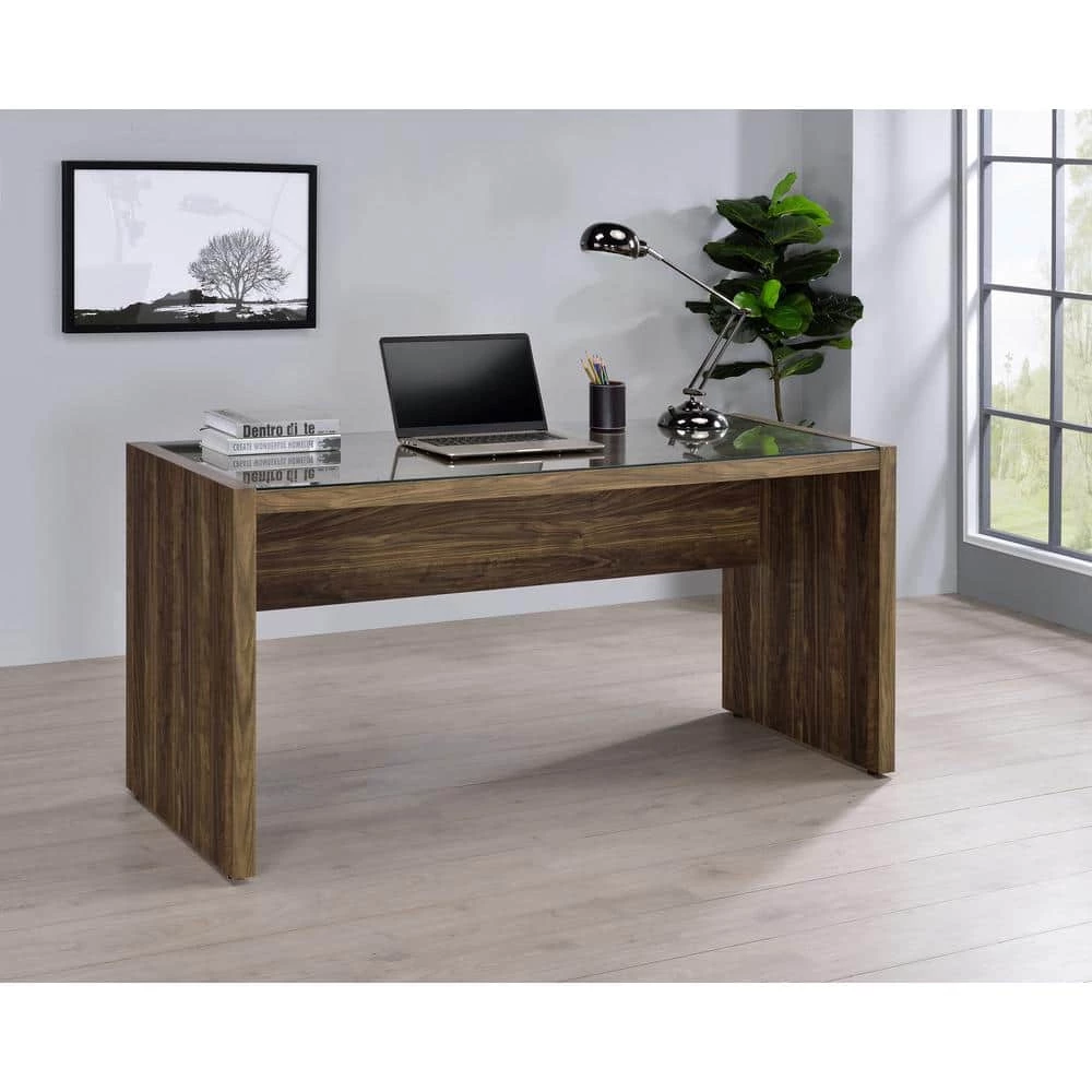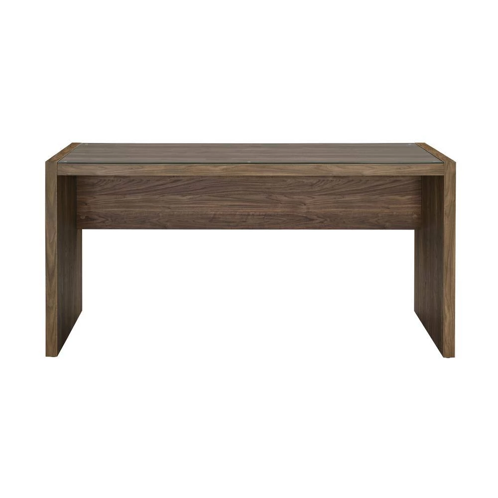 The sleek construction of this writing desk will have you doing day-long typing sessions. A simplistic rectangular tabletop is crated with tempered glass, giving plenty of room for a computer and notebooks. Slim yet sturdy legs provide incredible support. The aged walnut finish makes this a fantastic rustic style writing desk. Choose this piece for an immediate upgrade to your office.