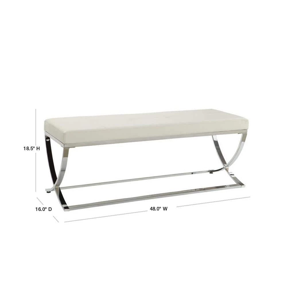 Light and airy ambiance offers a lift to modern bedrooms and living spaces. With a tasteful minimalist profile, this elegant bench delivers a perfect blend of style and substance. Sit on a padded surface wrapped in white leatherette upholstery. Enjoy the romantic accent of a chrome finish metal frame with gentle contours. Choose this bench for overflow seating in a central room, or an intriguing addition to entryway spaces.
