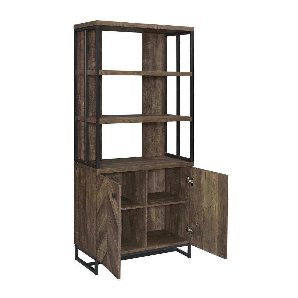 Compact and vertical, this bookcase is perfect for storing your home library collection. Designed with a rustic oak finish and a diagonal-like herringbone pattern that catches the eye. Resting and accented by a slim and sturdy heavy gauge steel frame in a gunmetal powder coated finish, this rustic bookcase offers an industrial style flair to a home office or living room. In addition, it features three open shelves to display decor and more, along with a two-door cabinet with two adjustable shelves to tuck items out of sight. Incorporate this country-inspired bookcase in a modern farmhouse style home.