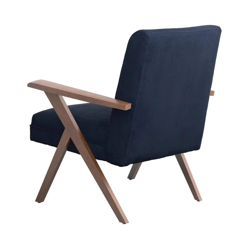 Go bold in both tones and silhouette when you add this fabric accent chair to your home. Chair is upholstered in soft dark blue fabric. Padded seat and back cushions provide hours of comfort. Rich brown armrests and legs offer warmth and support. It’s a bold, handsome addition to your living room or den.
