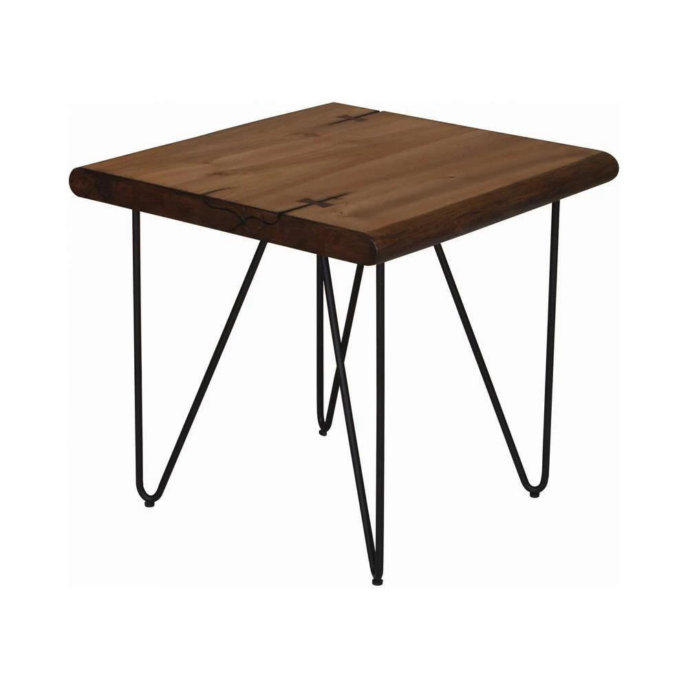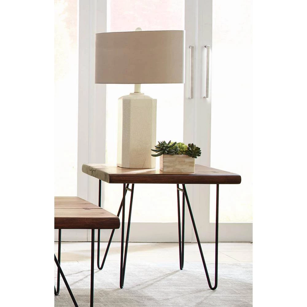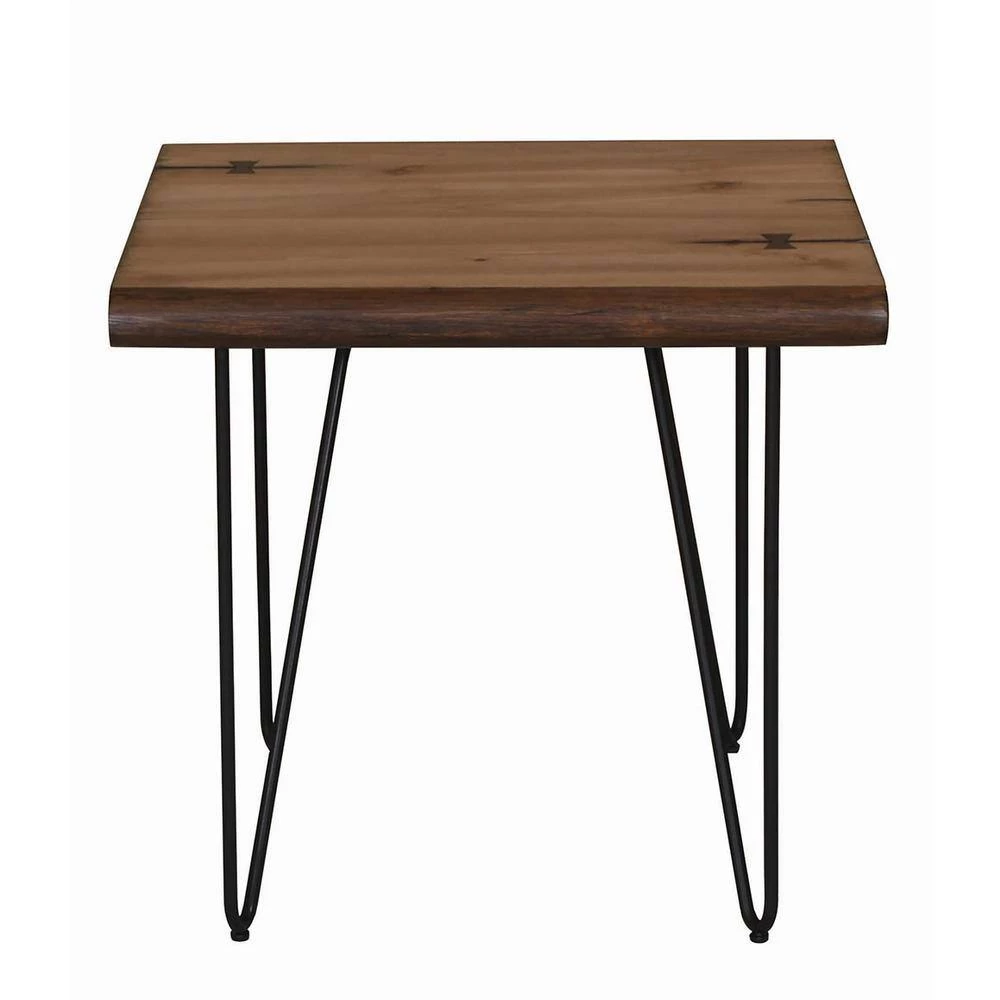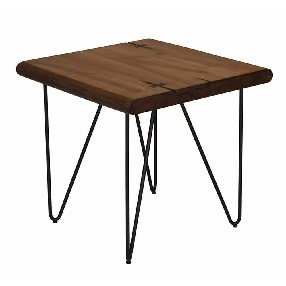 Sleek and stunning, this beautiful mid-century modern-inspired end table features open hairpin legs. Great for adding a retro feel to a living room, the rounded angles in the legs marry with the straight lines from the top to offer structure. In a natural honey and gunmetal finish, the warm and cool hues intermingle to give this end table it’s industrial personality. Beautiful with a plant or sculpture, the elongated lines look great in neutral and bold spaces. Full of balance and depth, the airy base opens up rooms.