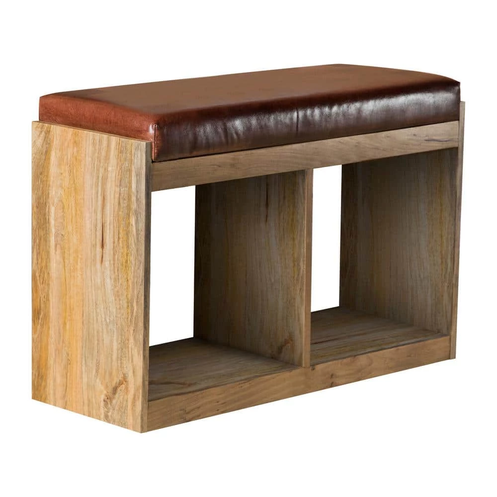 Storage and style are at your service with this attractive brown accent bench. The natural wood grain finish makes this a versatile piece in your home. Two storage compartments allow you to store small items within. Take a seat on the padded seating to put on your shoes or take a breather. This piece is supported on a platform base.