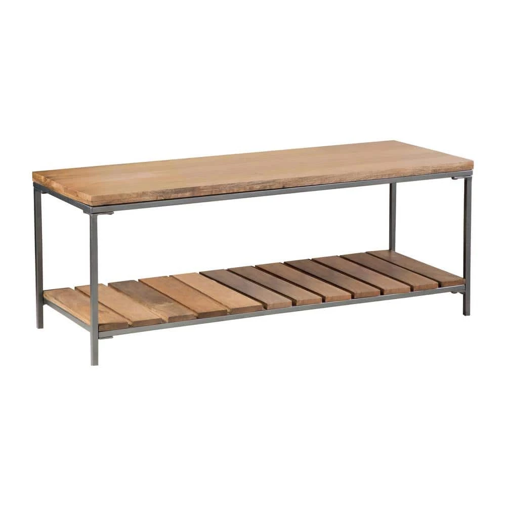 Look to this accent bench to provide an industrial element in your home. This piece boasts an expansive seating area with a natural wood finish. A gunmetal frame supports the bench while adding aesthetic appeal. Below, you’ll find an open shelf in a plank style design. Use it to store your favorite footwear or leave it open for an airy feel.