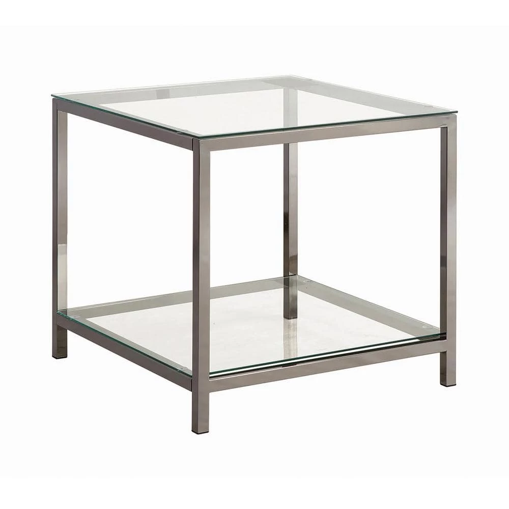 Build on a classic, somewhat conservative silhouette with tasteful upgrades. Following a traditional pattern, this end table hosts all of the elegant elements of a contemporary piece. Beautiful black nickel finish metal shapes a cubed silhouette with an open center. Tempered glass surfaces on its top and bottom shelf leave ample space for display and storage. this end table fulfills design and utility needs without a hitch.