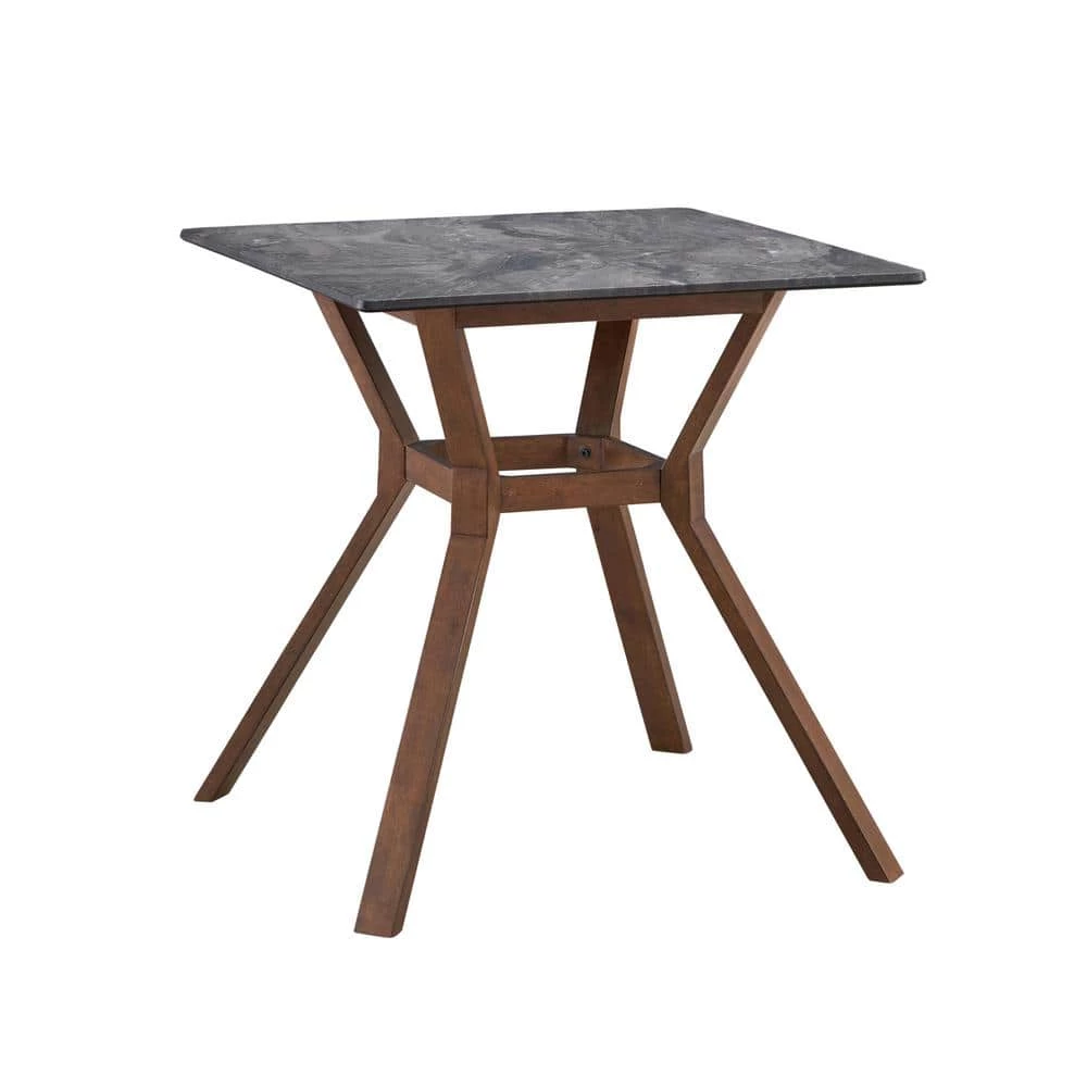 This counter height table is ideal for green-friendly homes and lifestyle. Featuring a sustainably crafted tabletop made of solid wood and recycled sawdust using a high pressured lamination process, this table is both sturdy and kind to the environment. With a square faux stone top, it is also easy to clean and quite resistant to the elements and accidents. Plus, the narrow and boomerang-shaped silhouette of the base lend a mid-century modern style that is sire to impress, complete with a natural walnut finish that complements numerous color palettes. Pull up a pair of counter height stool to accompany up to 4 people for cocktails or dinner.