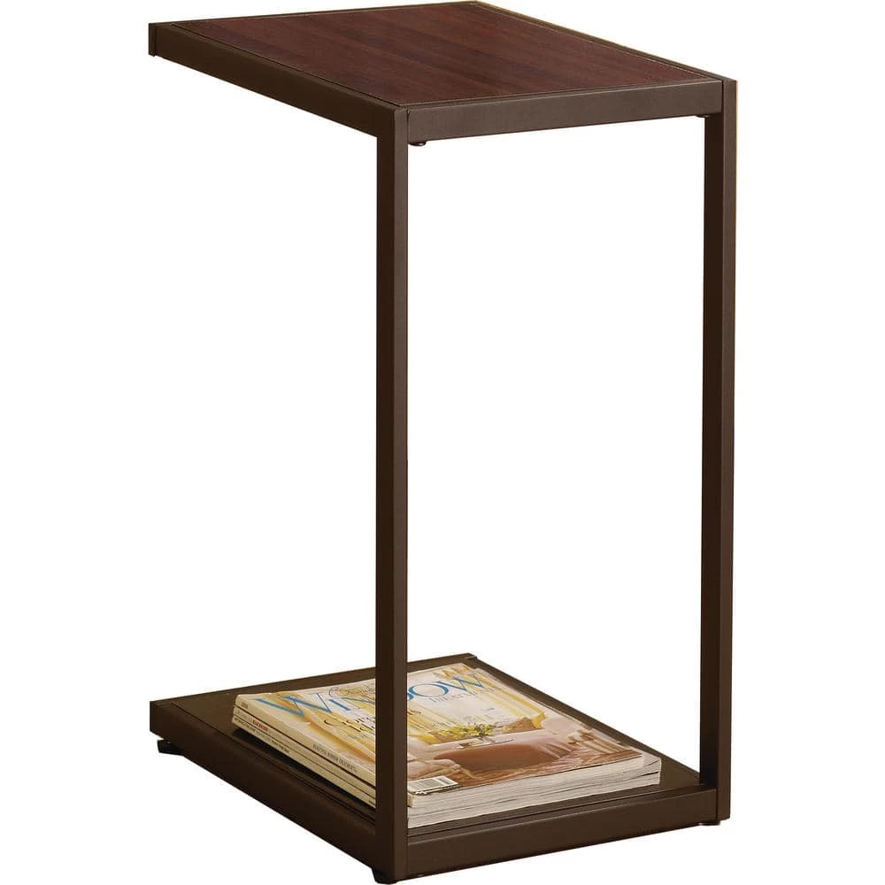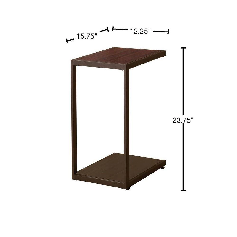 Make it easy to relax and enjoy entertainment without leaving the sofa. This snack table offers a handy way to serve while visiting and watching television. An angular shape delivers service on its top try and a bottom base that slides beneath a sofa or chair to provide easy access. Versatile dark brown offers a tasteful finish over a faux wood top, and an extra bottom shelf allows storage of periodicals and essentials. Keep this snack table handy for the drop-in guest.
