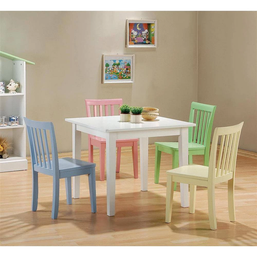 A child’s tea party has never been so enchantingly colorful. This five-piece youth table set from the Rory collection will brighten up any tea-and-cookie party. Simple, sleek table features a square top for all the party’s essentials. Four chairs in a medley of colors (charming pink, mint green, baby blue, and rich cream) will help make this the table so popular that kids from all over the neighborhood will be lining up to make reservations. This precious set will quickly become an endearing pleasure for your child.