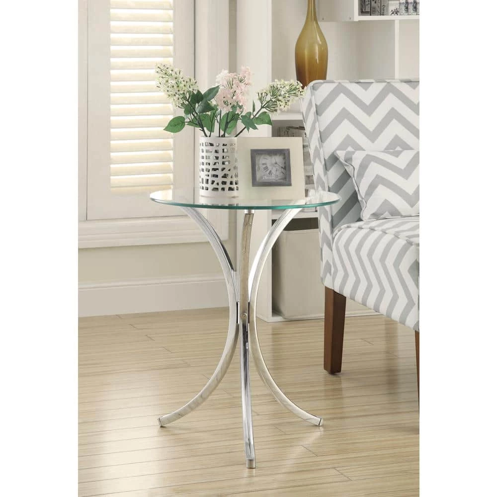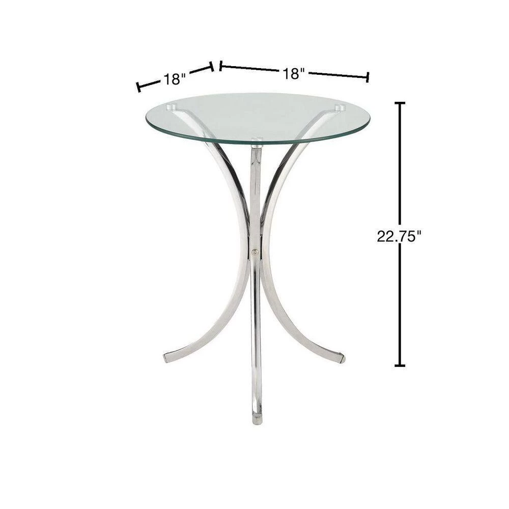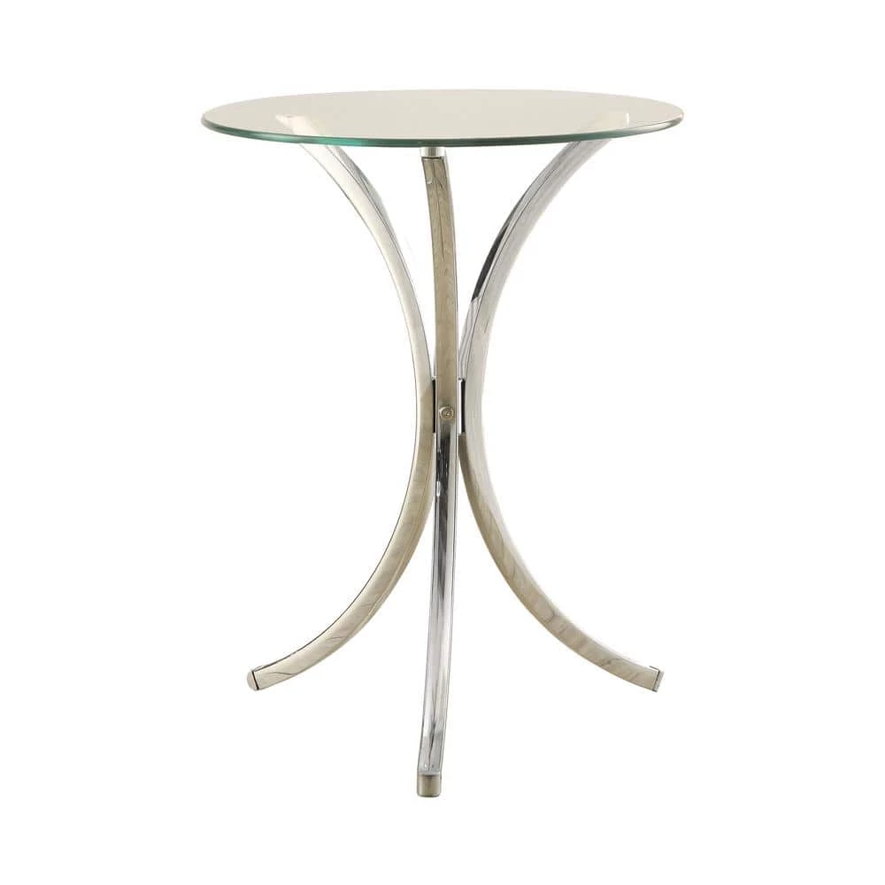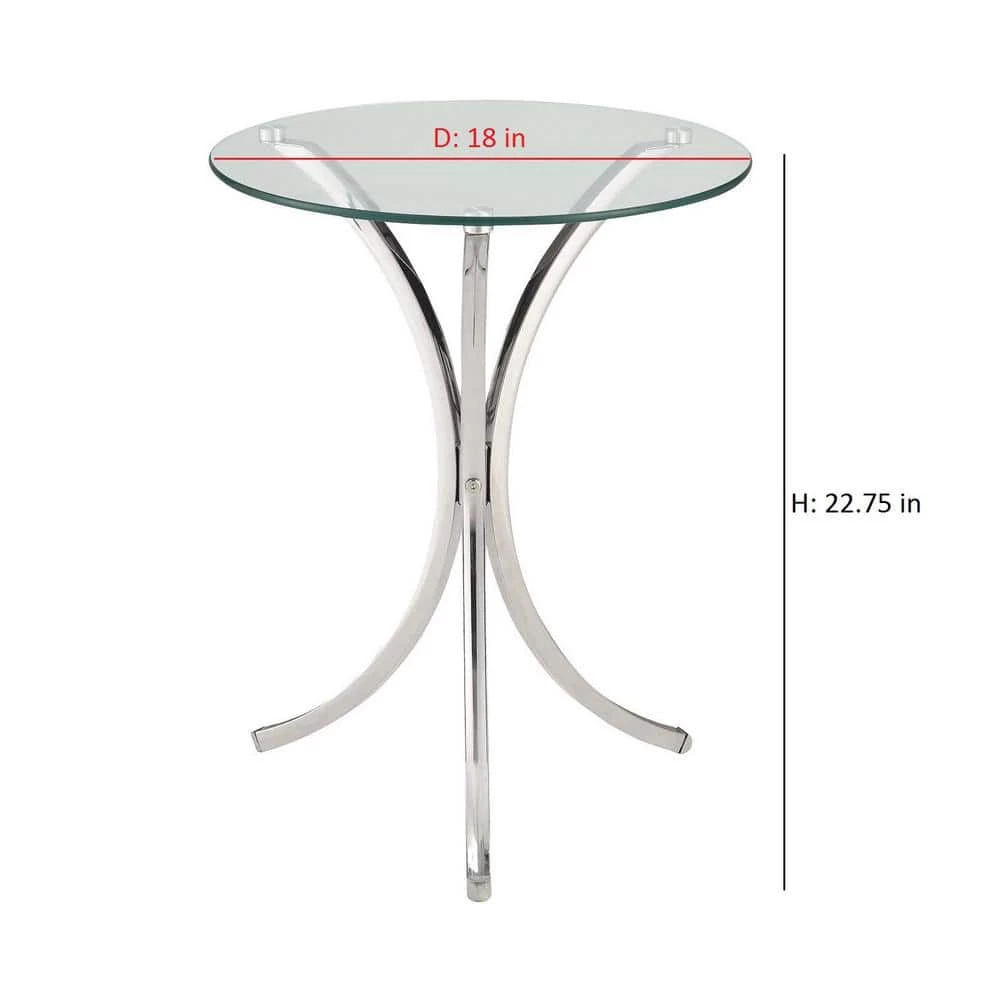 Smooth and simple, this chrome snack table offers a modern feel. Constructed of metal, the base consists of three curved legs in a bright chrome finish. Complement the metallic radiance with a clear tempered glass top. Full of rounded and delicate details, this table creates an airy look in a variety of spaces. Create movement with the elegance of the curved base and reflective finishes.