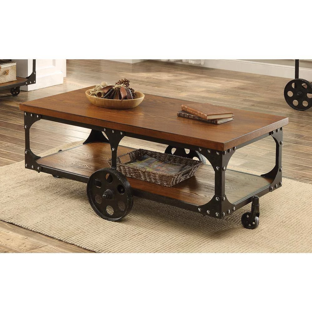 Enhance a traditional living room with down-home, country appeal. This coffee table is crafted with two large panels of rustic brown wood, infusing it with old-fashioned charm. Its classic silhouette is appealingly offset by the dark metal finish of its frame. A sturdy table top and large lower shelf offer ample storage space for your convenience. Complete with four fully functioning metal wheels, this table is attractive and versatile.