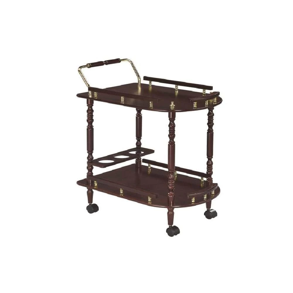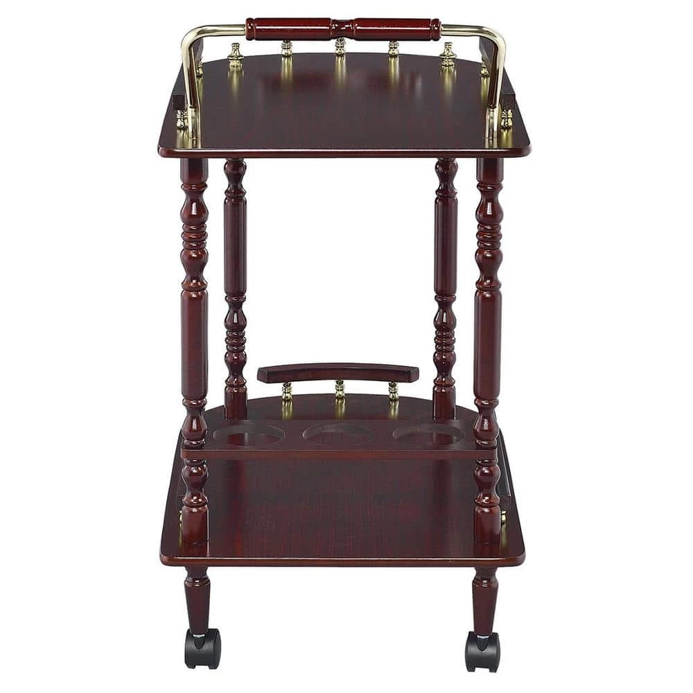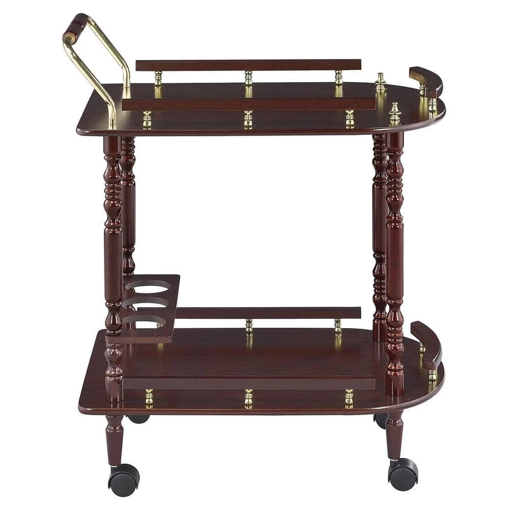 This classy serving cart will look at home in either your formal dining room or rec room. It features a handle pushing and top roomy top shelf for a cheese plate and two snifters of cognac. Bottom shelf includes a bottle holder for three bottles of your favorite Bordeaux and/or single malt. Elegantly crafted with merlot finish and brash-finish metal accents. Gives your room a traditional countryside appeal.