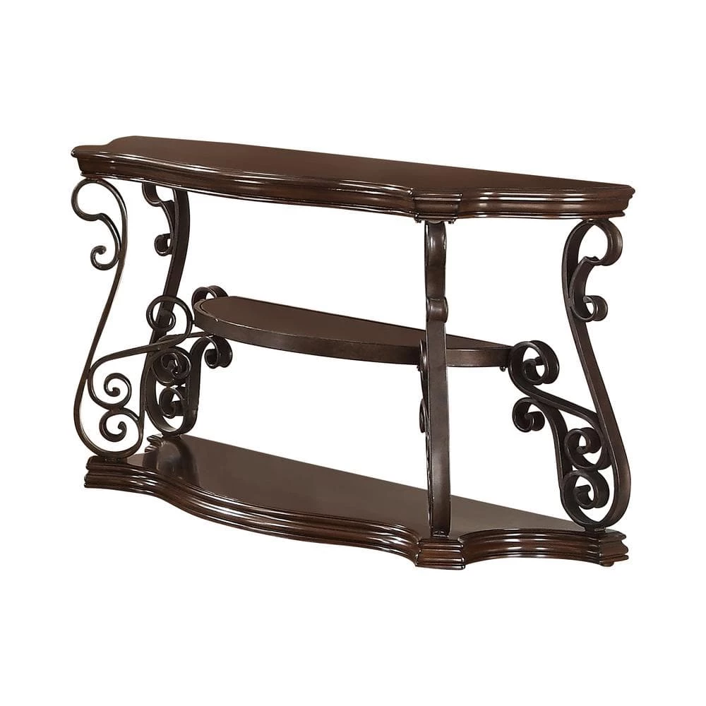 Add glamorous opulence to your living room decor. This sleek, stylish sofa table emanates luxurious appeal. Its base supports are designed with ornate metal scrollwork, adding an artful touch of sophistication. A rich merlot finish lends depth and opulence to its chic, beveled wood edges. Complete with a tempered glass top and storage shelf, this table enhances any home with magnificent beauty and versatility.
