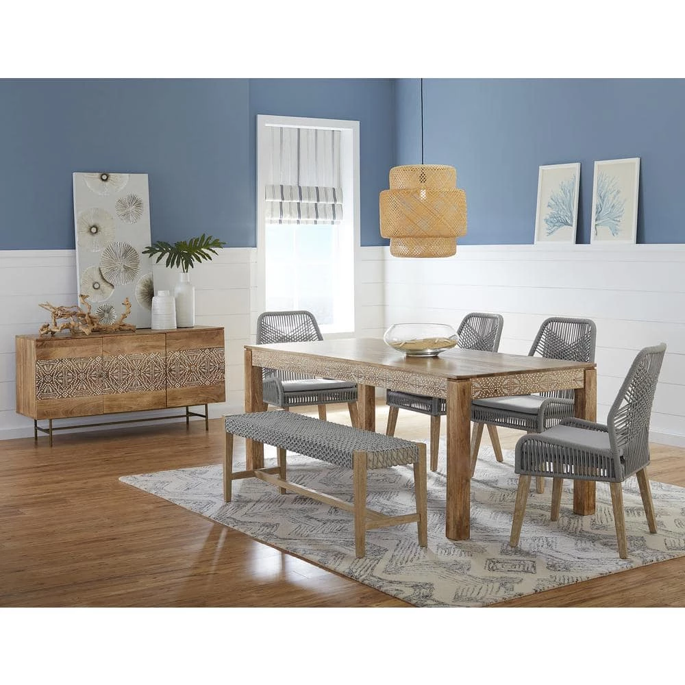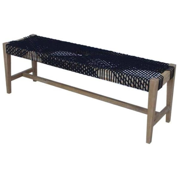 Constructed of a durable solid mahogany wood with a weathered finish, this transitional style bench offers a versatile seating space. With a coastal beach cottage style vibe, this bench offers nautical-inspired features, including an intricately woven rope seat reminiscent of fisherman nets. Place it aside a dining table or within an entryway foyer as a place to sit and remove your shoes after a long day. With slim tapered legs and a supportive brace, this bench is sure to last many years in your home. Find the right color for your existing decor palette with choices of a neutral grey or dark navy poly rope.