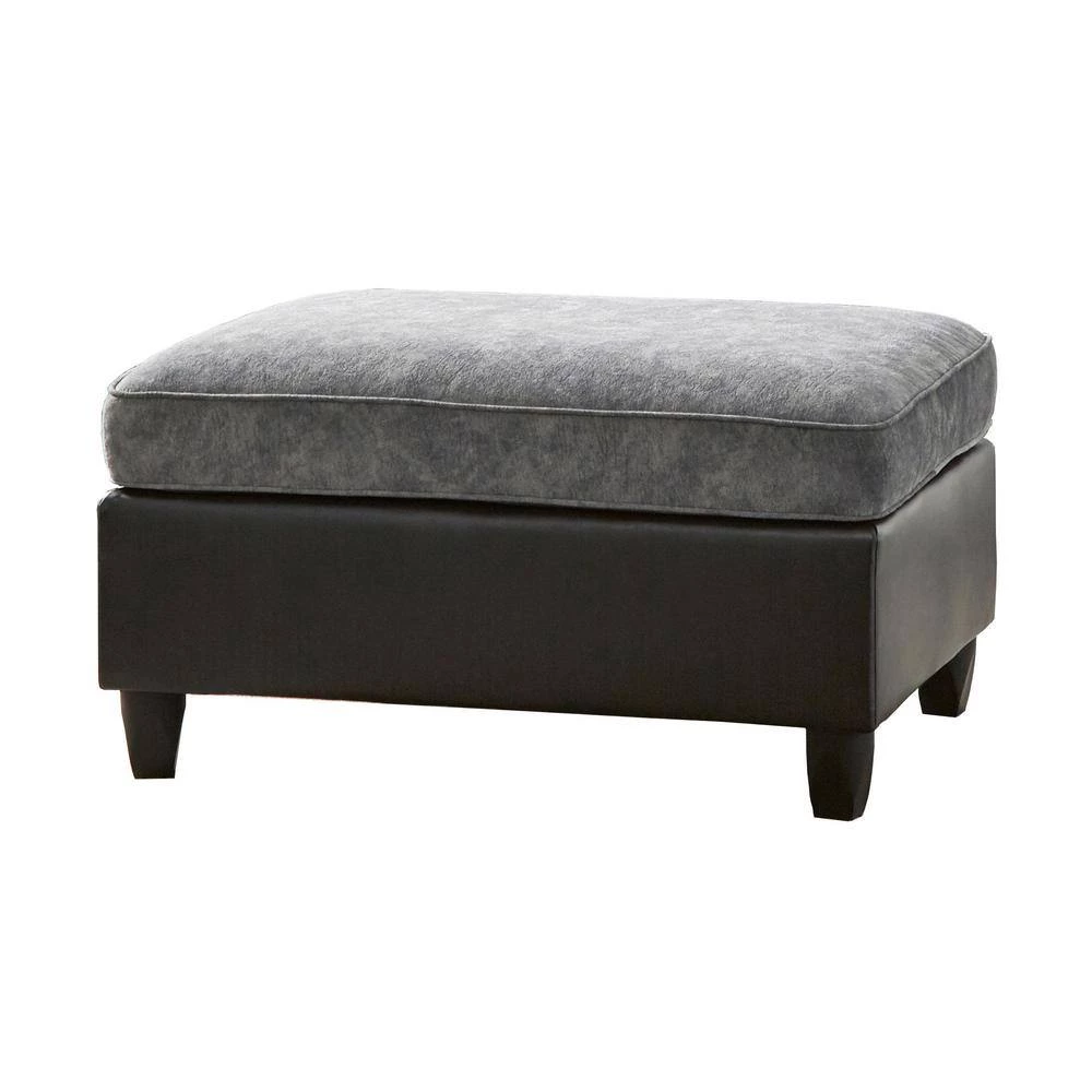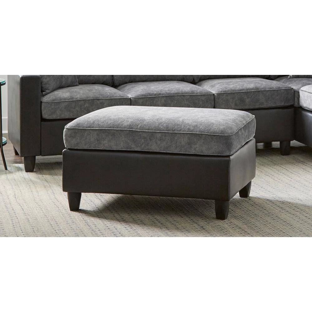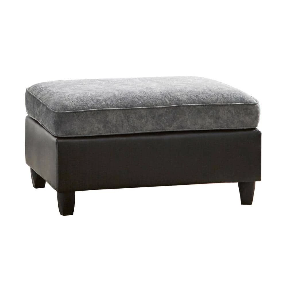 With a base wrapped in a black leatherette topped with a plush distressed pewter grey velvet, this ottoman offers all-day comfort and a minimal style. Elevated by tapered legs and featuring classic welt details along the top cushion, this ottoman can support kicked-up feet, refreshment trays and more. With a spacious rectangular shape, you can store a tray or plates of easy-to-reach snacks and wine. With a neutral color palette, this transitional ottoman lends itself to a variety of color palettes and contemporary style homes. Create an entire ensemble with the matching sectional.