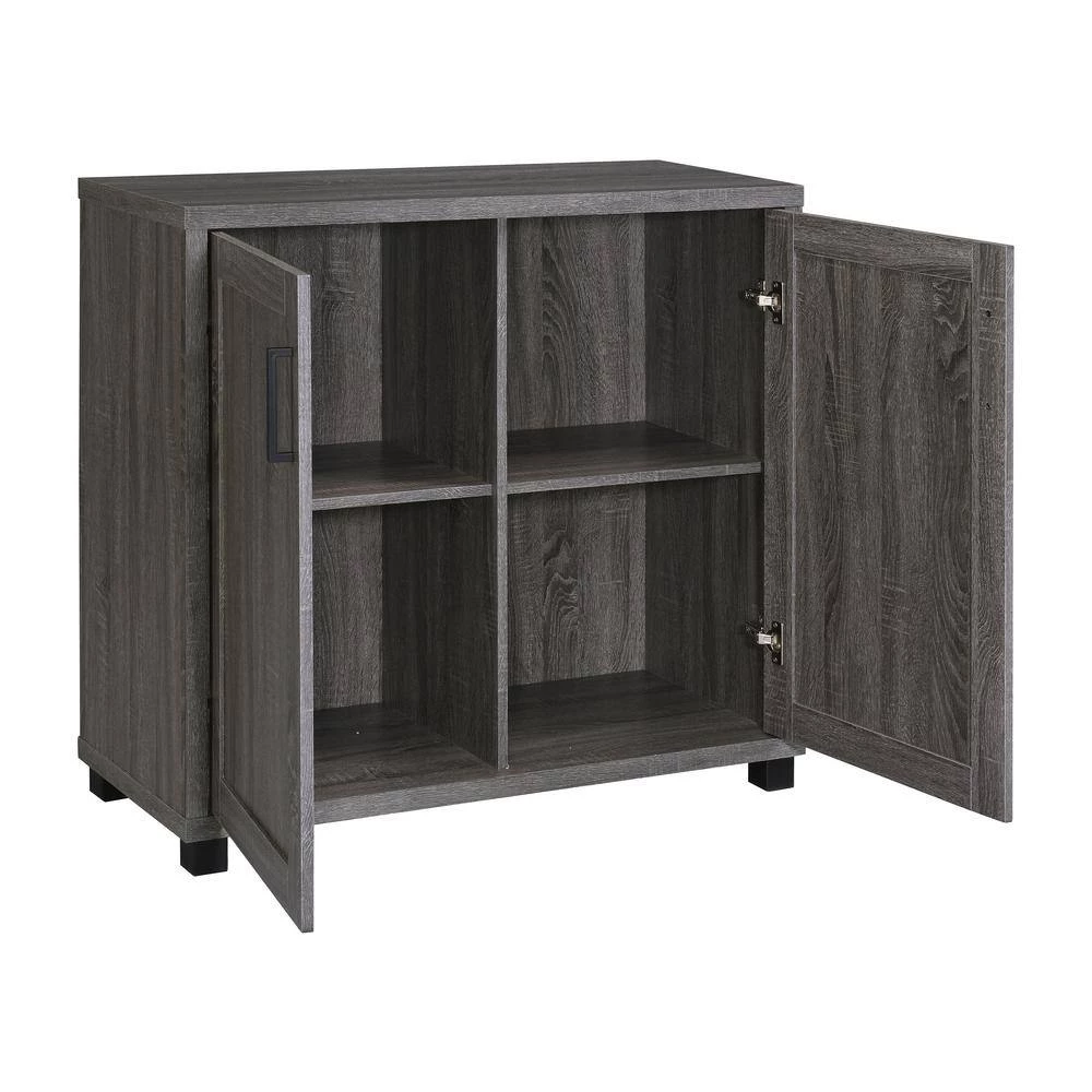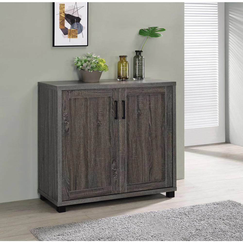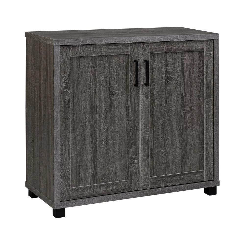 With a weathered grey finish throughout, this rustic accent cabinet lends a striking modern flair to its country-inspired aesthetic. Place this chic accent cabinet in a modern farmhouse home for extra storage space or to create a coffee station. Supported by steel legs, it offers complete support and stability. And with a two-door cabinet, each with a black powder coated hardware, it keeps everything neat and organized in four interior storage compartments. Along the flush tabletop, add some barware or a vase to welcome you home, placing it in a living room or foyer.