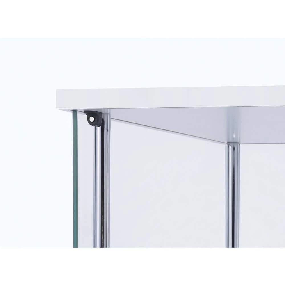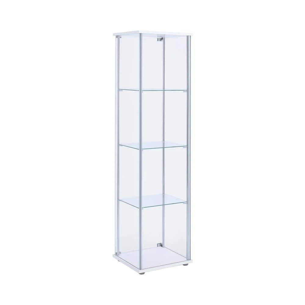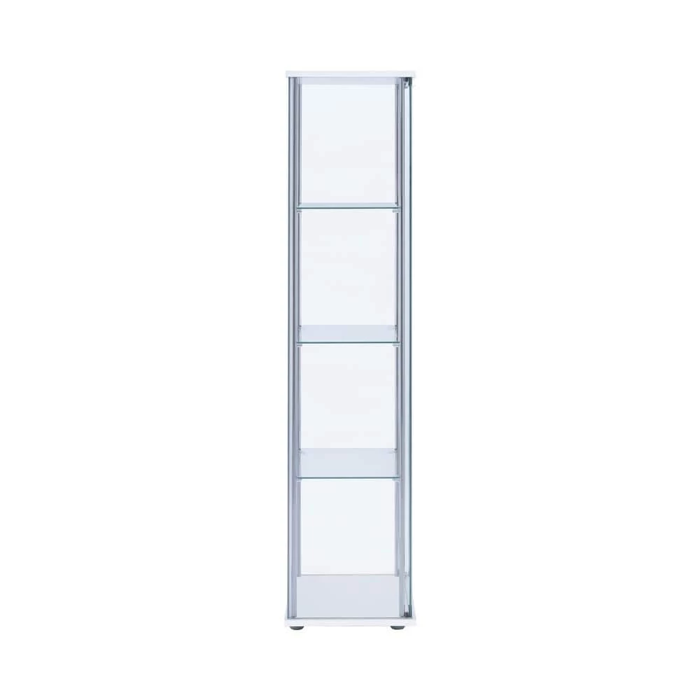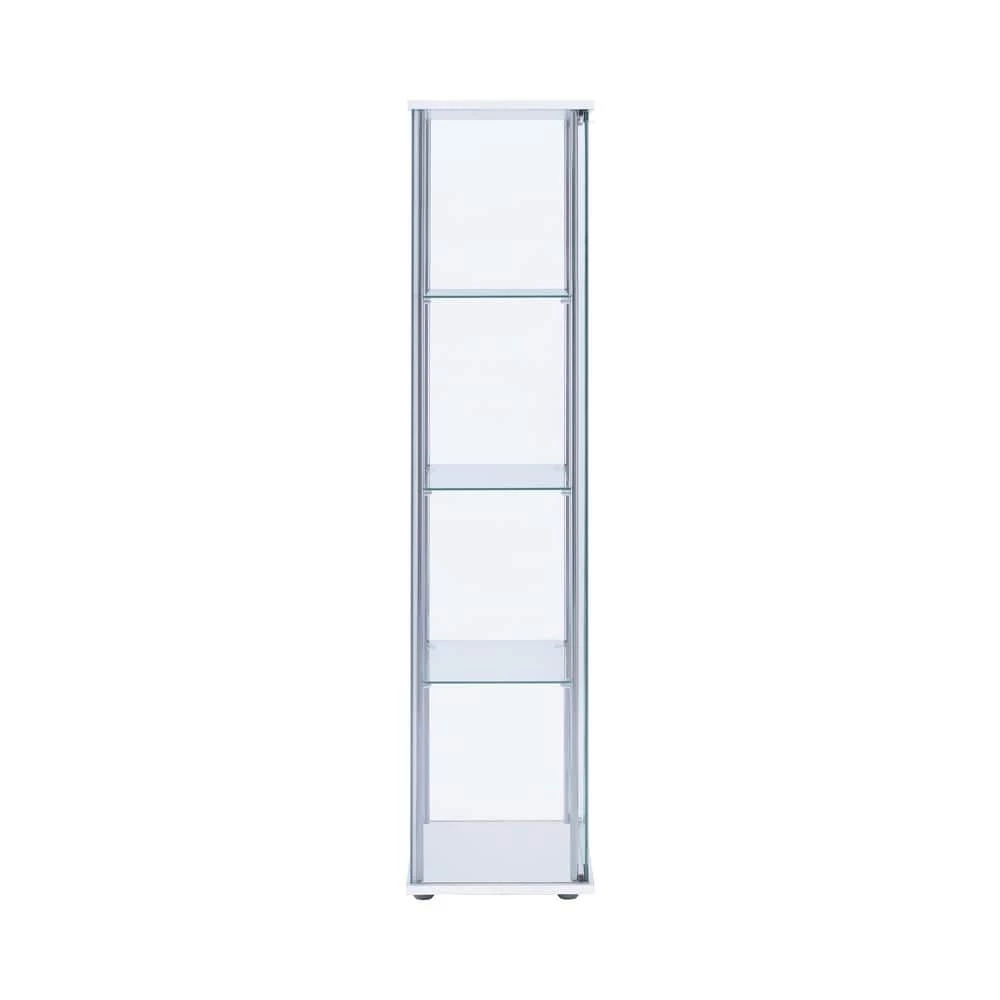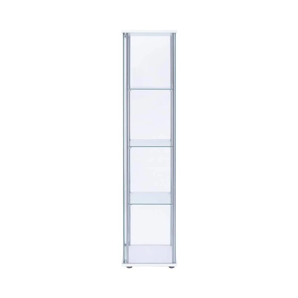 Perfect for decorative plates and vases, this white curio cabinet helps to open up space. Sleek and tall, the four shelves are great for adding visual height to a living or dining room. Smooth chrome details complement the clear modern shape. Neutral in color and silhouette, this cabinet is versatile. Store belongings in style while streamlining space.