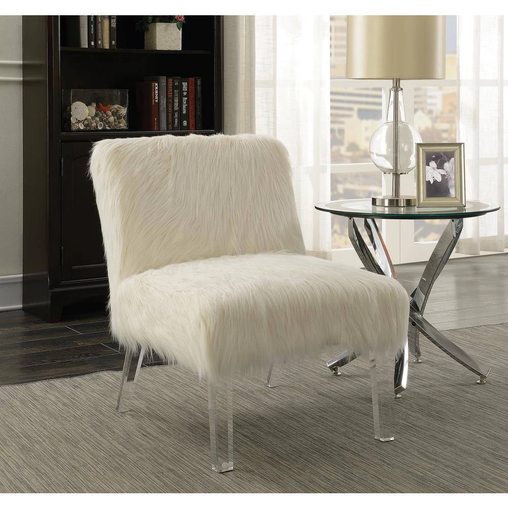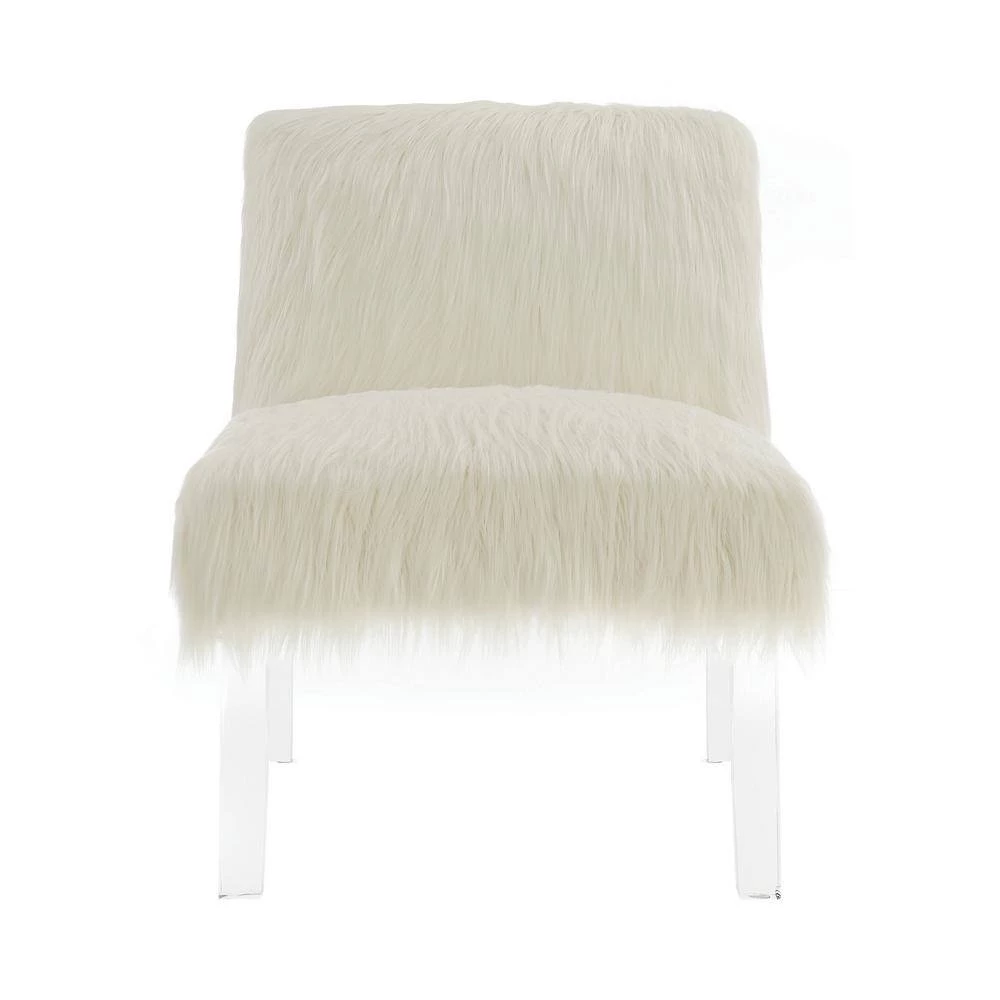 Explore the 1960s personality of your inner designer self. Fashionable and festive, this accent chair reignites the romance of a beloved nostalgic era. A low-profile minimalist silhouette offers seating comfort. Warm, fuzzy white textile-like fabric casts a retro ambiance and infuses tons of charm. Clear acrylic legs shore up its whimsical personality and add a dose of fun.