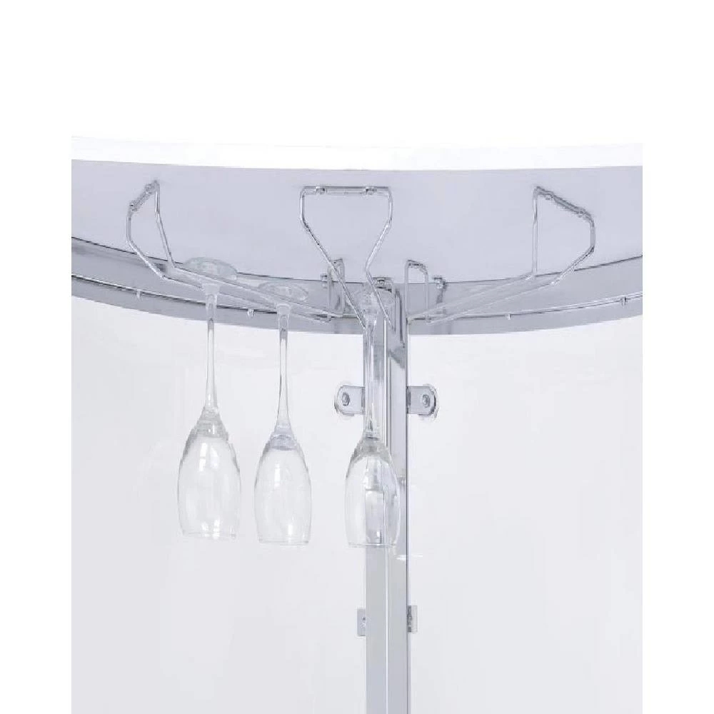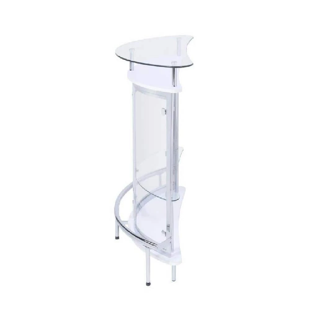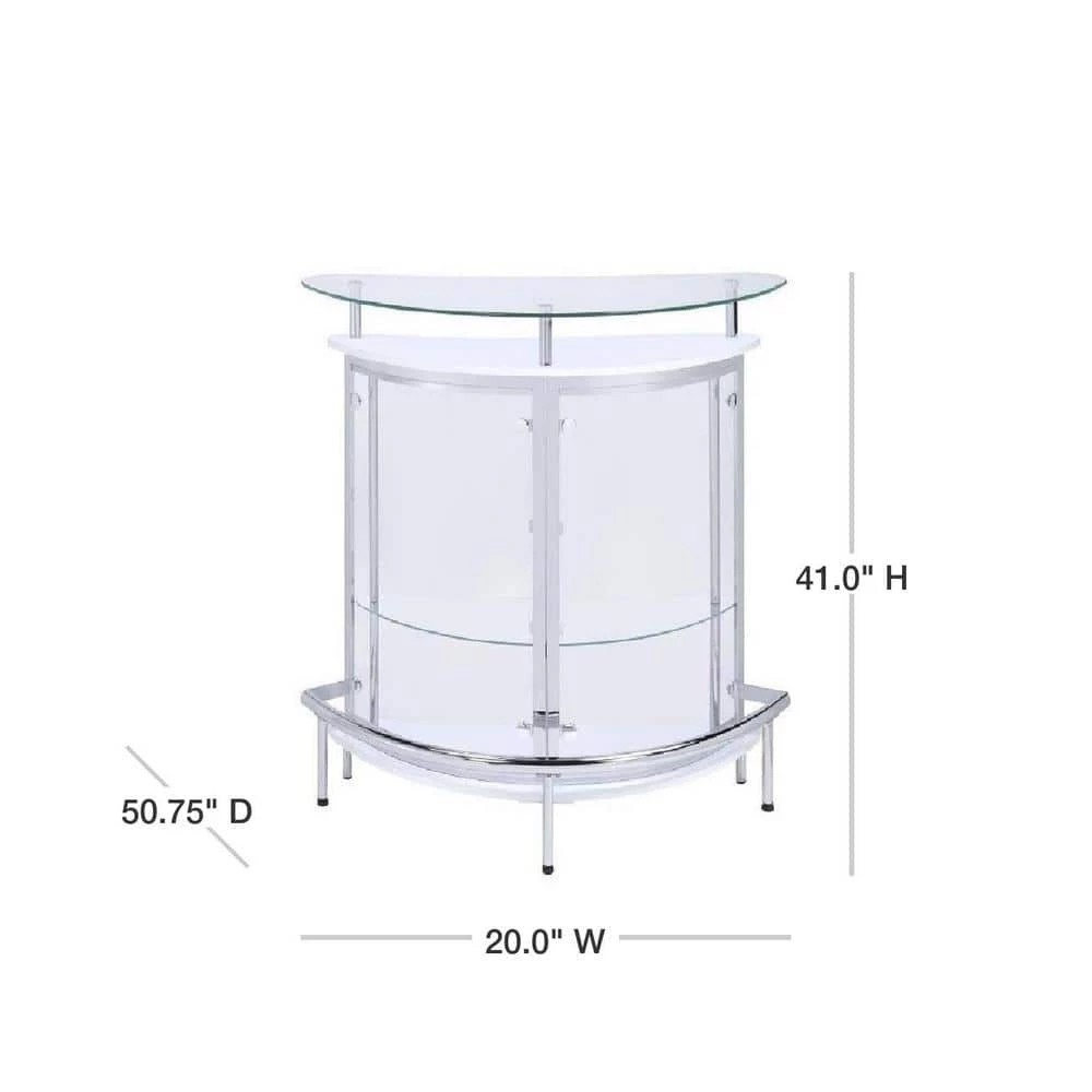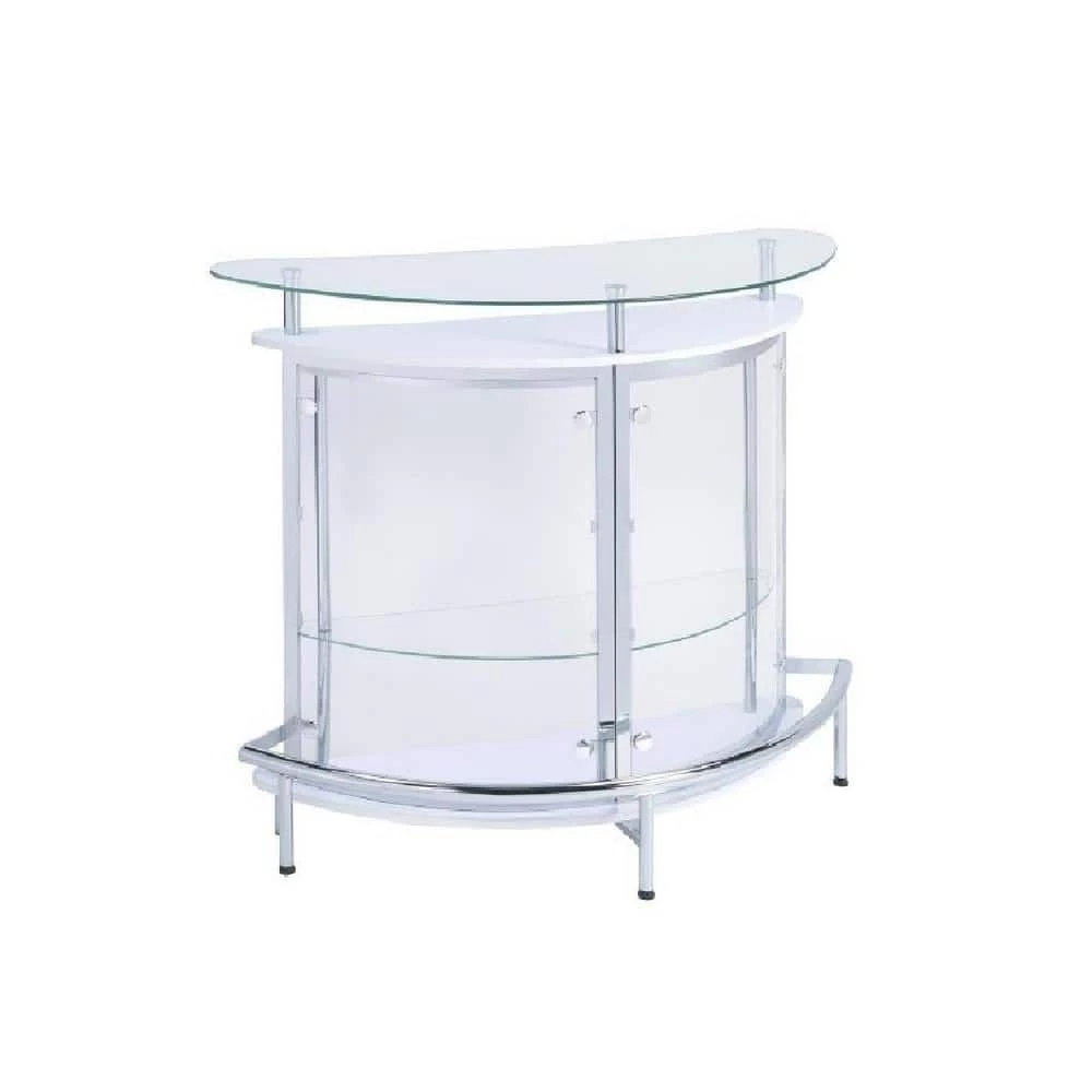Upgrade your home entertainment options with this gorgeous, contemporary bar unit. With a convenient wine glass rack and ample storage space, it easily accommodates a wide variety of stemware, bar accessories, and cocktail ingredients. Graceful and glamorous, its curved silhouette is beautifully accentuated with gleaming chrome accents. A large, tempered glass top gives you plenty of prep space to mix delicious drinks for your guests. Complete with clear acrylic panels, this stylish unit allows you to show off your collection of fine wines and spirits in style.